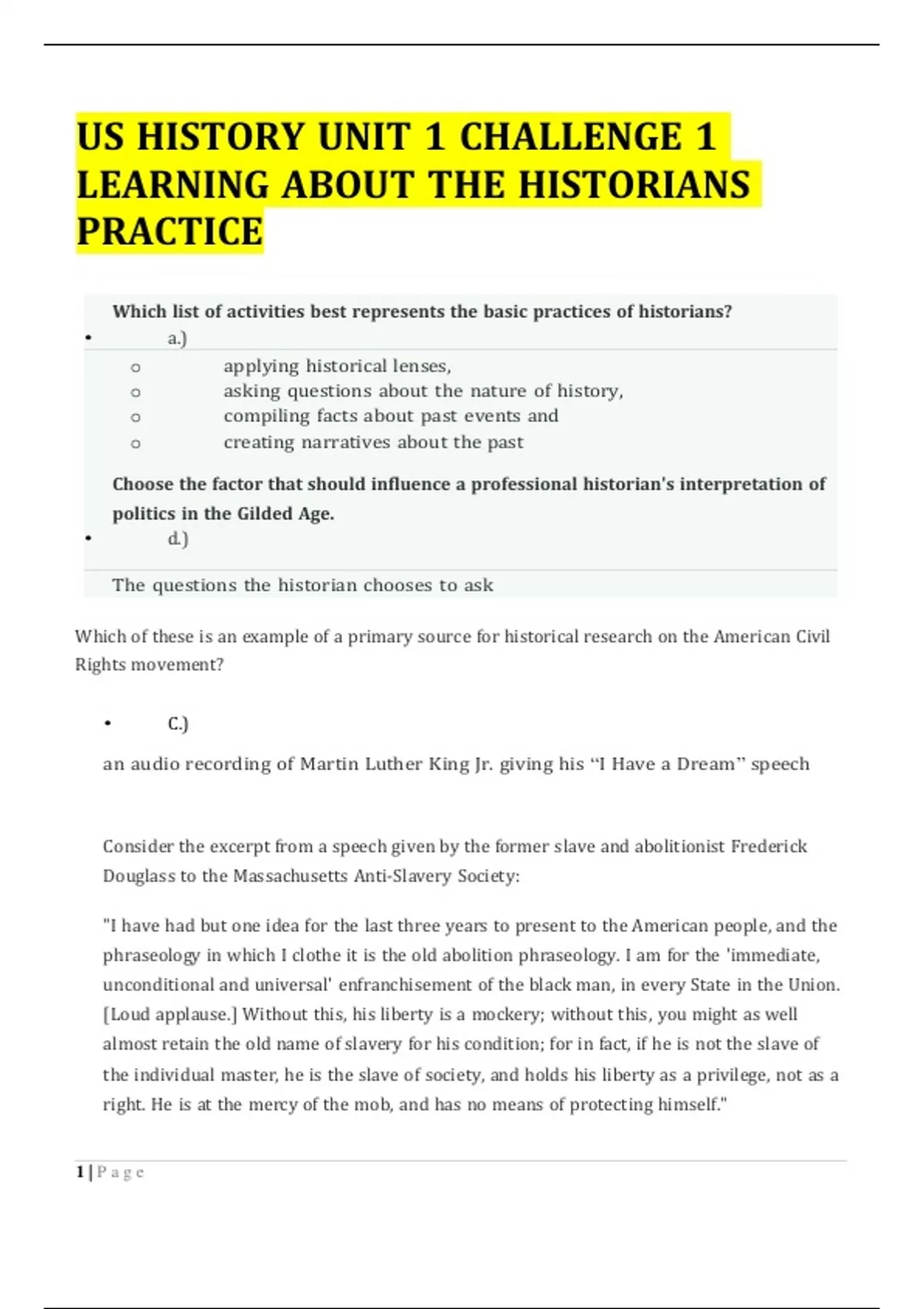 US HISTORY UNIT 1 CHALLENGE 1 LEARNING ABOUT THE HISTORIANS PRACTICE Which list of activities best represents the basic practices of historians? a.) o o o o applying historical lenses, asking questions about the nature of history, compiling facts about past events and creating narratives about the past Choose the factor that should influence a professional historian's interpretation of politics in the Gilded Age. • d.) The questions the historian chooses to ask Which of these is an example of a primary source for historical research on the American Civil Rights movement? • C.) an audio recording of Martin Luther King Jr. giving his “I Have a Dream” speech Consider the excerpt from a speech given by the former slave and abolitionist Frederick Douglass to the Massachusetts Anti-Slavery Society