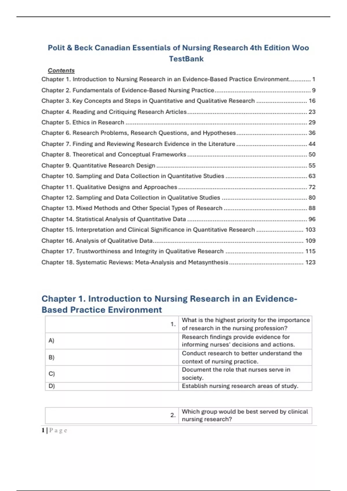Test Bank Polit & Beck Canadian Essentials of Nursing Research 4th Edition Woo Contents Chapter 1. Introduction to Nursing Research in an Evidence-Based Practice Environment ............ 1 Chapter 2. Fundamentals of Evidence-Based Nursing Practice ..................................................... 9 Chapter 3. Key Concepts and Steps in Quantitative and Qualitative Research ............................ 16 Chapter 4. Reading and Critiquing Research Articles .................................................................. 23 Chapter 5. Ethics in Research .................................................................................................... 29 Chapter 6. Research Problems, Research Questions, and Hypotheses ....................................... 36 Chapter 7. Finding and Reviewing Research Evidence in the Literature ....................................... 44 Chapter 8. Theoretical and Conceptual Frameworks .................................................................. 50 Chapter 9. Quantitative Research Design ................................................................................... 55 Chapter 10. Sampling and Data Collection in Quantitative Studies ............................................. 63 Chapter 11. Qualitative Designs and Approaches ....................................................................... 72 Chapter 12. Sampling and Data Collection in Qualitative Studies ............................................... 80 Chapter 13. Mixed Methods and Other Special Types of Research .............................................. 88 Chapter 14. Statistical Analysis of Quantitative Data .................................................................. 96 Chapter 15. Interpretation and Clinical Significance in Quantitative Research .......................... 103 Chapter 16. Analysis of Qualitative Data ................................................................................... 109 Chapter 17. Trustworthiness and Integrity in Qualitative Research ........................................... 115 Chapter 18. Systematic Reviews: Meta-Analysis and Metasynthesis ......................................... 123 Chapter 1. Introduction to Nursing Research in an EvidenceBased Practice Environment 1. A) B) C) D) 2. 1 | P a g e What is the highest priority for the importance of research in the nursing profession? Research findings provide evidence for informing nurses' decisions and actions. Conduct research to better understand the context of nursing practice. Document the role that nurses serve in society. Establish nursing research areas of study. Which group would be best served by clinical nursing research?A) B) C) D) Nursing administrators Practicing nurses Nurses' clients Healthcare policymakers 3. A) B) C) D) 4. A) B) C) D) In the United States, in what area does research play an important role in nursing? Chronic illness Credentialing and status Nurses' personalities Nurses' education What is the role of a consumer of nursing research? Read research reports for relevant findings. Participate in generating evidence by doing research. Participate in journal club in a practice setting. Solve clinical problems and make clinical decisions. 5. What was the concern of most nursing studies in the early 1900s? 2 | P a g eA) B) C) D) Client satisfaction Clinical problems Health promotion Nursing education 6. A) B) C) D) Which topic most closely conforms to the priorities that have been suggested for future nursing research? Attitudes of nursing students toward smoking. Promotion of excellence in nursing science. Nursing staff morale and turnover. Number of doctorate prepared nurses in various clinical specialties. 7. What is the process of deductive reasoning? A) B) C) D) Verifying assumptions that are part of our heritage. Developing specific predictions from general principles. Empirically testing observations that are made known through our senses. Forming generalizations from specific observations. 8. A) B) C) D) What is the ontological assumption of those espousing a naturalistic paradigm? Objective reality and those natural phenomena are regular and orderly. Phenomena are not haphazard and result from prior causes. Reality is multiply constructed and multiply interpreted by humans. Reality is not fixed, but is rather a construction of human minds. 9. A) 3 | P a g e What is the epistemological assumption of those espousing a positivist paradigm? The researcher is objective and independent of those being studied.B) Phenomena are not haphazard, but rather have antecedent causes. 4 | P a g eC) The researcher instructs those being studied to be objective in providing information. D) Reality is not fixed, but is rather a construction of human minds. 10. A) B) C) D) Which is not a characteristic of traditional scientific method? Control over external factors. Systematic measurement and observation of natural phenomena. Deductive reasoning. Emphasis on a holistic view of a phenomenon, studied in a rich context. 11. What is empiricism? A) B) C) D) Making generalizations from specific observations. Deducing specific predictions from generalizations. Gathering evidence rooted in reality. Verifying the assumptions on which the study was based. A) B) C) D) 12. What is a hallmark of the scientific method? Infallible Holistic Systematic Flexible 13. A) B) C) D) 5 | P a g e Which of the following limits the power of the scientific method to answer questions about human life? The necessity of departing from traditional beliefs. The difficulty of accurately measuring complex human traits. The inability to control potential biases. The shortage of theories about human behavior.A) B) C) D) 14. What is a criticism of the scientific method? Deductive Deterministic Empirical Reductionist 15. A) B) C) D) What is involved in naturalistic qualitative research? Involves deductive processes Takes places in the field. Focuses on the idiosyncrasies of those being studied. Attempts to