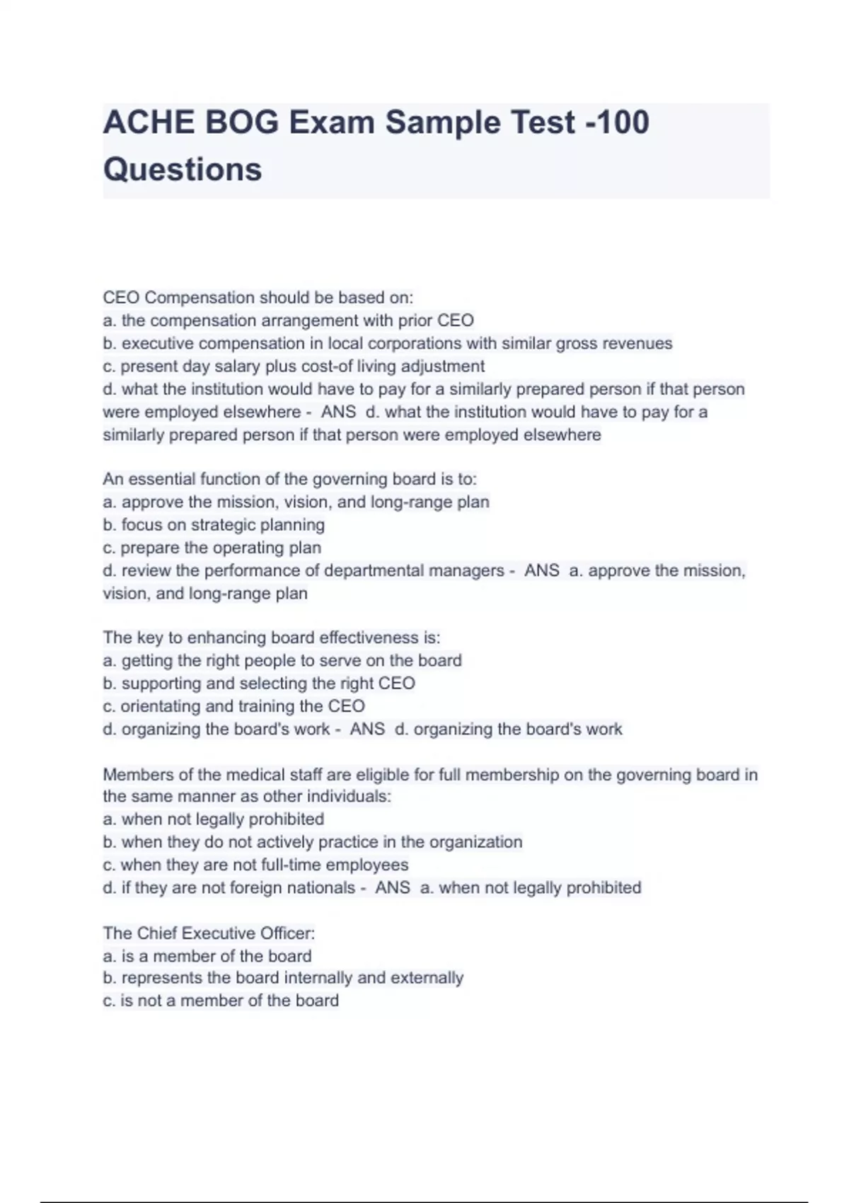 ACHE BOG Exam Sample Test -100 Questions With verified Answers CEO Compensation should be based on: a. the compensation arrangement with prior CEO b. executive compensation in local corporations with similar gross revenues c. present day salary plus cost-of living adjustment d. what the institution would have to pay for a similarly prepared person if that person were employed elsewhere - ANS d. what the institution would have to pay for a similarly prepared person if that person were employed elsewhere An essential function of the governing board is to: a. approve the mission, vision, and long-range plan b. focus on strategic planning c. prepare the operating plan d. review the performance of departmental managers - ANS a. approve the mission, vision, and long-range plan The key to enhancing board effectiveness is: a. getting the right people to serve on the board b. supporting and selecting the right CEO c. orientating and training the CEO d. organizing the board's work - ANS d. organizing the board's work Members of the medical staff are eligible for full membership on the governing board in the same manner as other individuals: a. when not legally prohibited b. when they do not actively practice in the organization c. when they are not full-time employees d. if they are not foreign nationals - ANS a. when not legally prohibited The Chief Executive Officer: a. is a member of the board b. represents the board internally and externally c. is not a member of the board d. has a contract with the board - ANS b. represents the board internally and externally Regarding the budget, the board: a. does not use the budget exercise as a way to improve quality and productivity b. gets involved in preparing budgets for all operational units c. decides which personnel are needed in top management d. establishes guidelines and makes final choices among competing opportunities - ANS d. establishes guidelines and makes final choices among competing opportunities