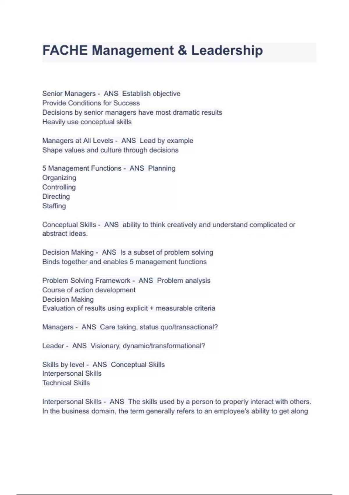 FACHE Management & Leadership Questions And Answers Senior Managers - ANS Establish objective Provide Conditions for Success Decisions by senior managers have most dramatic results Heavily use conceptual skills Managers at All Levels - ANS Lead by example Shape values and culture through decisions 5 Management Functions - ANS Planning Organizing Controlling Directing Staffing Conceptual Skills - ANS ability to think creatively and understand complicated or abstract ideas. Decision Making - ANS Is a subset of problem solving Binds together and enables 5 management functions Problem Solving Framework - ANS Problem analysis Course of action development Decision Making Evaluation of results using explicit + measurable criteria Managers - ANS Care taking, status quo/transactional? Leader - ANS Visionary, dynamic/transformational? Skills by level - ANS Conceptual Skills Interpersonal Skills Technical Skills Interpersonal Skills - ANS The skills used by a person to properly interact with others. In the business domain, the term generally refers to an employee's ability to get along with others while getting the job done. Interpersonal skills include everything from communication and listening skills to attitude and deportment. Good interpersonal skills are a prerequisite for many positions in an organization. Technical Skills - ANS A quality describes behavioral or competency-based criteria logically associated with the successful accomplishment of important tasks/responsibilities in a particular job. Required technical skills are sometimes found on the job description Successful Leader/Managers integrate all these roles smoothly - ANS Interpersonal Roles -Figure Head -Influences Informational Roles -Monitor Spokesperson Decisional Roles -Entrepreneur -Negotiator
