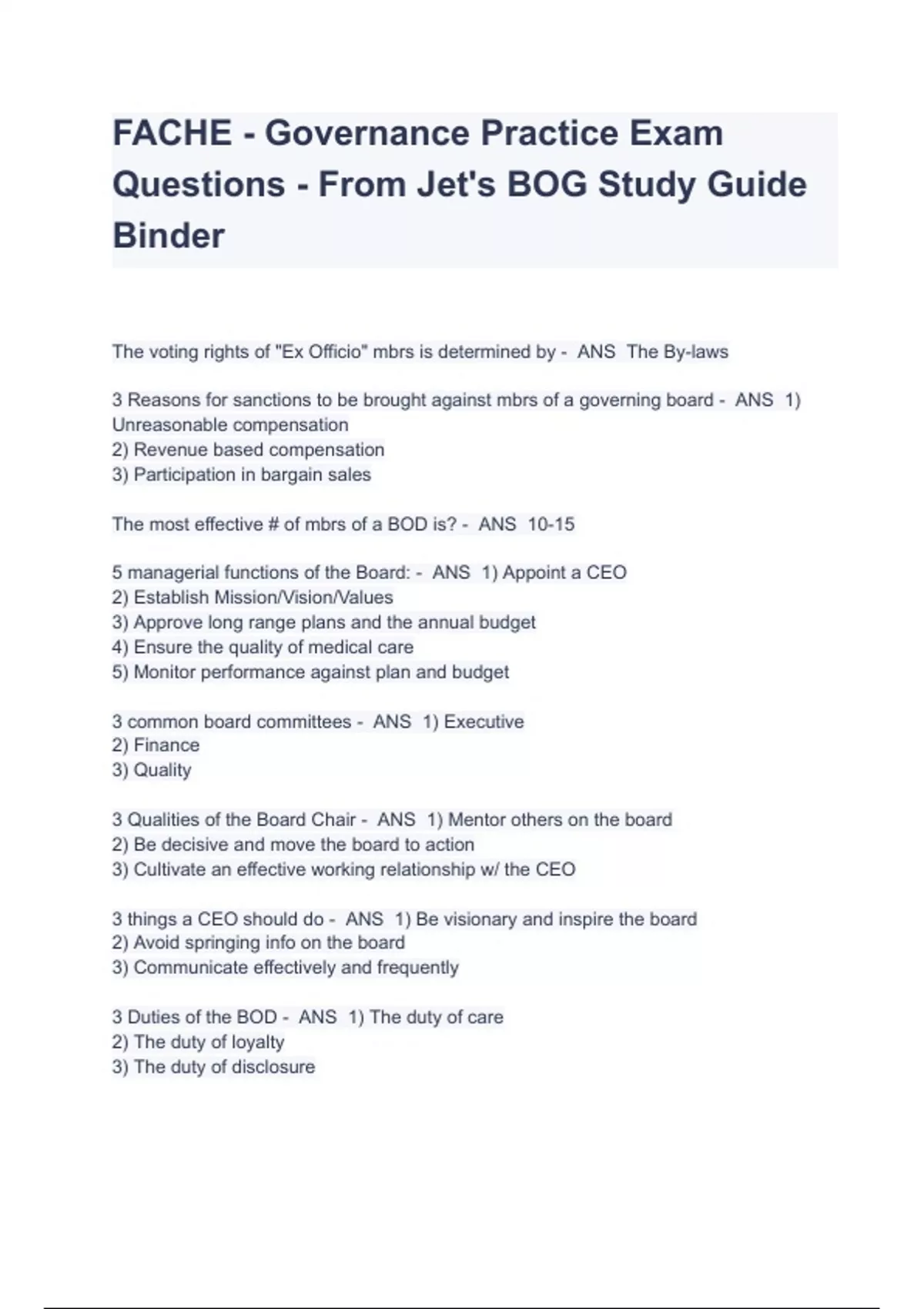 FACHE - Governance Practice Exam Questions - From Jet's BOG Study Guide Binder The voting rights of "Ex Officio" mbrs is determined by - ANS The By-laws 3 Reasons for sanctions to be brought against mbrs of a governing board - ANS 1) Unreasonable compensation 2) Revenue based compensation 3) Participation in bargain sales The most effective # of mbrs of a BOD is? - ANS 10-15 5 managerial functions of the Board: - ANS 1) Appoint a CEO 2) Establish Mission/Vision/Values 3) Approve long range plans and the annual budget 4) Ensure the quality of medical care 5) Monitor performance against plan and budget 3 common board committees - ANS 1) Executive 2) Finance 3) Quality 3 Qualities of the Board Chair - ANS 1) Mentor others on the board 2) Be decisive and move the board to action 3) Cultivate an effective working relationship w/ the CEO 3 things a CEO should do - ANS 1) Be visionary and inspire the board 2) Avoid springing info on the board 3) Communicate effectively and frequently 3 Duties of the BOD - ANS 1) The duty of care 2) The duty of loyalty 3) The duty of disclosure