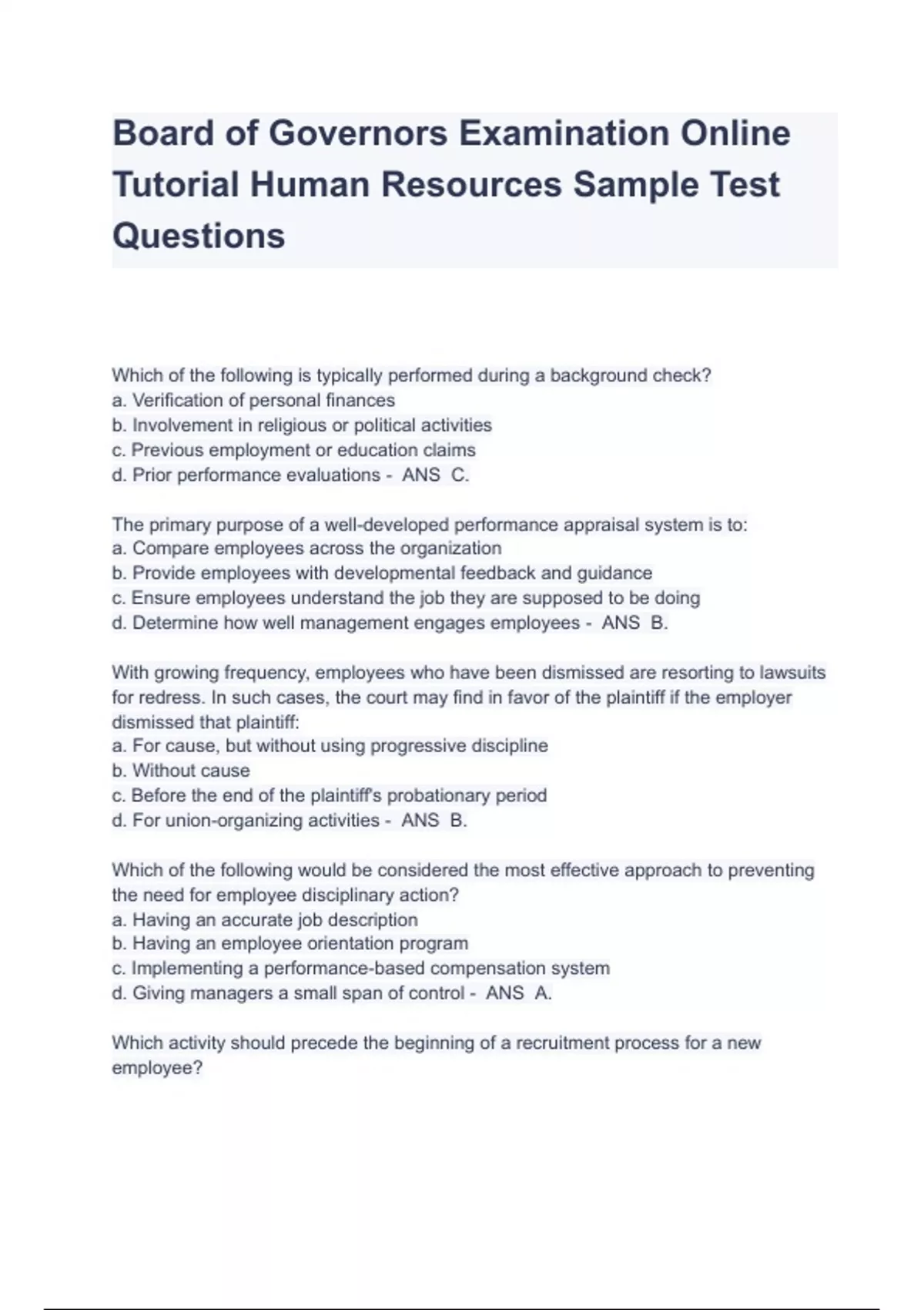 Board of Governors Examination Online Tutorial Human Resources Sample Test Questions Which of the following is typically performed during a background check? a. Verification of personal finances b. Involvement in religious or political activities c. Previous employment or education claims d. Prior performance evaluations - ANS C. The primary purpose of a well-developed performance appraisal system is to: a. Compare employees across the organization b. Provide employees with developmental feedback and guidance c. Ensure employees understand the job they are supposed to be doing d. Determine how well management engages employees - ANS B. With growing frequency, employees who have been dismissed are resorting to lawsuits for redress. In such cases, the court may find in favor of the plaintiff if the employer dismissed that plaintiff: a. For cause, but without using progressive discipline b. Without cause c. Before the end of the plaintiff's probationary period d. For union-organizing activities - ANS B. Which of the following would be considered the most effective approach to preventing the need for employee disciplinary action? a. Having an accurate job description b. Having an employee orientation program c. Implementing a performance-based compensation system d. Giving managers a small span of control - ANS A. Which activity should precede the beginning of a recruitment process for a new employee?