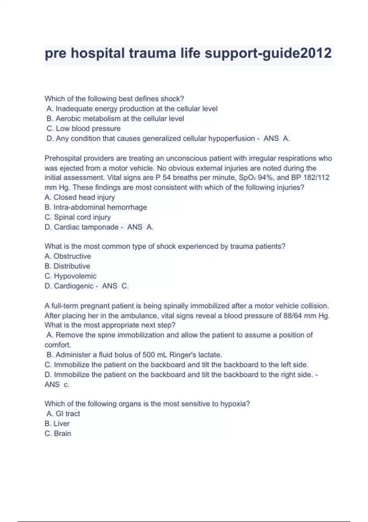 pre hospital trauma life support-guide2012 Which of the following best defines shock? A. Inadequate energy production at the cellular level B. Aerobic metabolism at the cellular level C. Low blood pressure D. Any condition that causes generalized cellular hypoperfusion - ANS A. Prehospital providers are treating an unconscious patient with irregular respirations who was ejected from a motor vehicle. No obvious external injuries are noted during the initial assessment. Vital signs are P 54 breaths per minute, SpO₂ 94%, and BP 182/112 mm Hg. These findings are most consistent with which of the following injuries? A. Closed head injury B. Intra-abdominal hemorrhage C. Spinal cord injury D. Cardiac tamponade - ANS A. What is the most common type of shock experienced by trauma patients? A. Obstructive B. Distributive C. Hypovolemic D. Cardiogenic - ANS C. A full-term pregnant patient is being spinally immobilized after a motor vehicle collision. After placing her in the ambulance, vital signs reveal a blood pressure of 88/64 mm Hg. What is the most appropriate next step? A. Remove the spine immobilization and allow the patient to assume a position of comfort. B. Administer a fluid bolus of 500 mL Ringer's lactate. C. Immobilize the patient on the backboard and tilt the backboard to the left side. D. Immobilize the patient on the backboard and tilt the backboard to the right side. - ANS c. Which of the following organs is the most sensitive to hypoxia? A. GI tract B. Liver C. Brain D. Kidney - ANS C. A 33-year-old male was involved in a house fire and the primary survey reveals stridor, bradypnea, and soot around the nose/mouth. Multiple attempts at airway management have been unsuccessful. Which destination is most appropriate for this patient? A. Level-one trauma center (40 min away) B. Level-two trauma center (20 min away) C. Burn facility (50 min away) D. Community hospital (10 min away) - ANS D. When ventilating the average adult patient, how much air should be delivered into the lungs during each ventilation? A. 250 mL B. 500 mL C. 750 mL D. 1000 mL - ANS B.