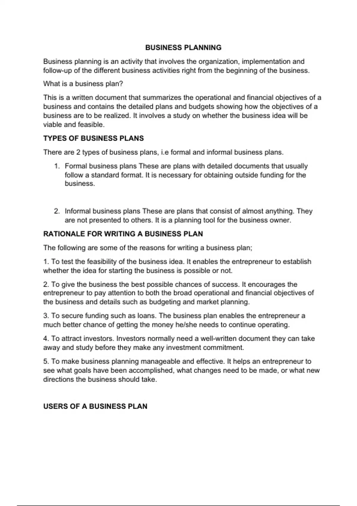 This document provides students with a review of business planning topic such as the definition of a business plan, different types of business plans, their writing format, and the advantages and disadvantages of a business plan.