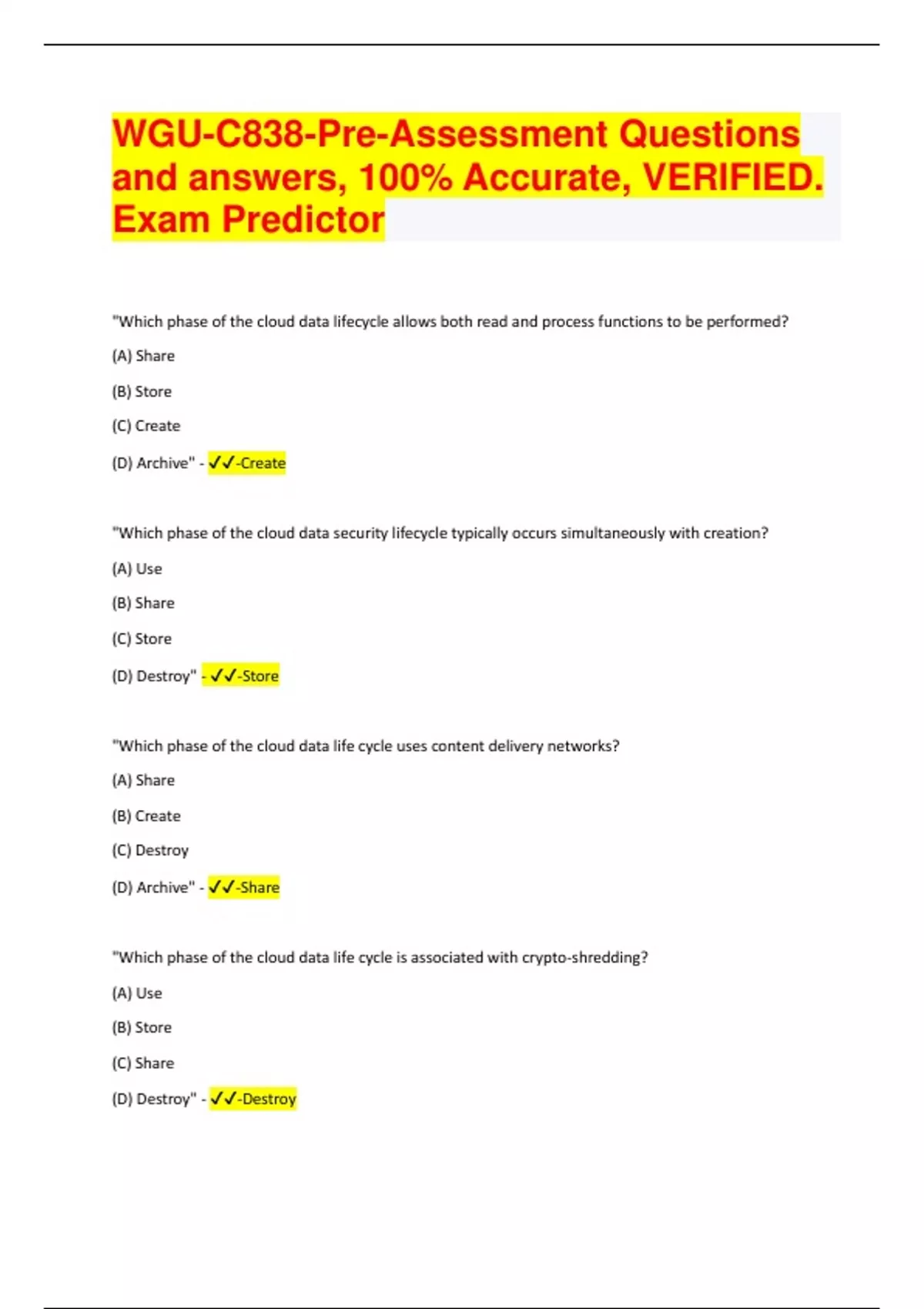 "Which phase of the cloud data lifecycle allows both read and process functions to be performed? (A) Share (B) Store (C) Create (D) Archive" - -Create "Which phase of the cloud data security lifecycle typically occurs simultaneously with creation? (A) Use (B) Share (C) Store (D) Destroy" - -Store "Which phase of the cloud data life cycle uses content delivery networks? (A) Share (B) Create (C) Destroy (D) Archive" - -Share "Which phase of the cloud data life cycle is associated with crypto-shredding? (A) Use (B) Store (C) Share (D) Destroy" - -Destroy"Which cloud data storage architecture allows sensitive data to be replaced with unique identification symbols that retain all the essential information about the data without compromising its security? (A) Obfuscation (B) Tokenization (C) Anonymization (D) Randomization" - -Tokenization