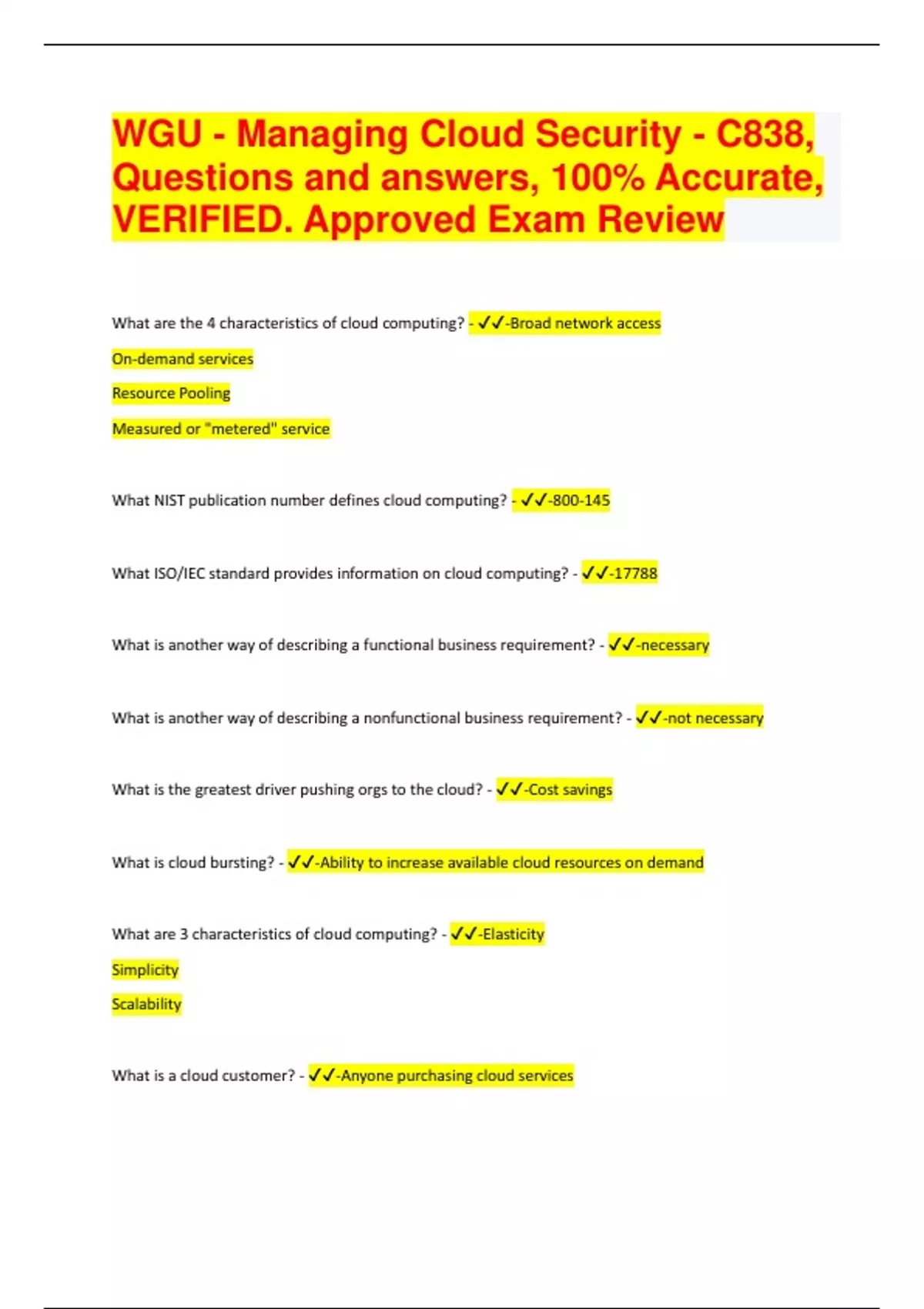 WGU - Managing Cloud Security - C838, Questions and answers, 100% Accurate, VERIFIED. Approved Exam Review | 46 Pages