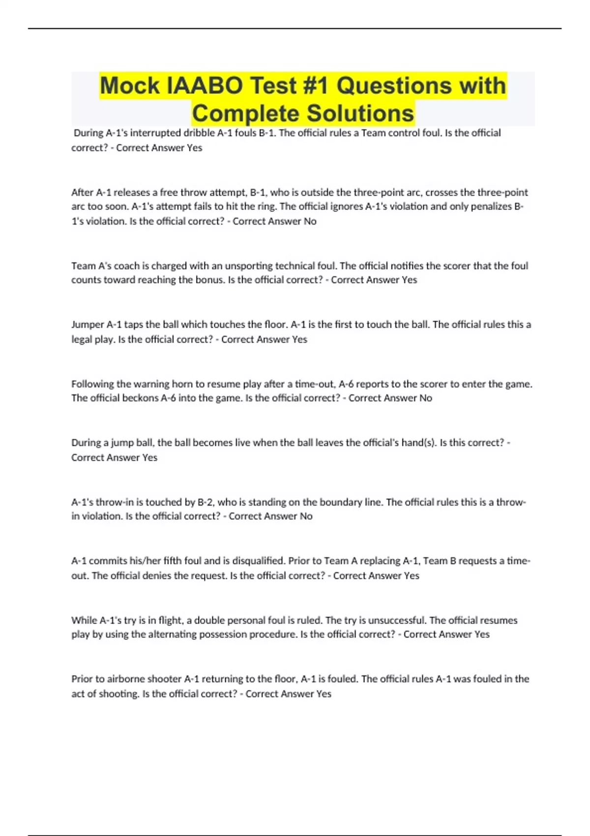 Mock IAABO Test #1 Questions with Complete Solutions During A-1's interrupted dribble A-1 fouls B-1. The official rules a Team control foul. Is the official correct? - Correct Answer Yes After A-1 releases a free throw attempt, B-1, who is outside the three-point arc, crosses the three-point arc too soon. A-1's attempt fails to hit the ring. The official ignores A-1's violation and only penalizes B-1's violation. Is the official correct? - Correct Answer No Team A's coach is charged with an unsporting technical foul. The official notifies the scorer that the foul counts toward reaching the bonus. Is the official correct? - Correct Answer Yes Jumper A-1 taps the ball which touches the floor. A-1 is the first to touch the ball. The official rules this a legal play. Is the official correct? - Correct Answer Yes Following the warning horn to resume play after a time-out, A-6 reports to the scorer to enter the game. The official beckons A-6 into the game. Is the official correct? - Correct Answer No During a jump ball, the ball becomes live when the ball leaves the official's hand(s). Is this correct? - Correct Answer Yes A-1's throw-in is touched by B-2, who is standing on the boundary line. The official rules this is a throw-in violation. Is the official correct? - Correct Answer No A-1 commits his/her fifth foul and is disqualified. Prior to Team A replacing A-1, Team B requests a time-out. The official denies the request. Is the official correct? - Correct Answer Yes While A-1's try is in flight, a double personal foul is ruled. The try is unsuccessful. The official resumes play by using the alternating possession procedure. Is the official correct? - Correct Answer Yes Prior to airborne shooter A-1 returning to the floor, A-1 is fouled. The official rules A-1 was fouled in the act of shooting. Is the official correct? - Correct Answer Yes