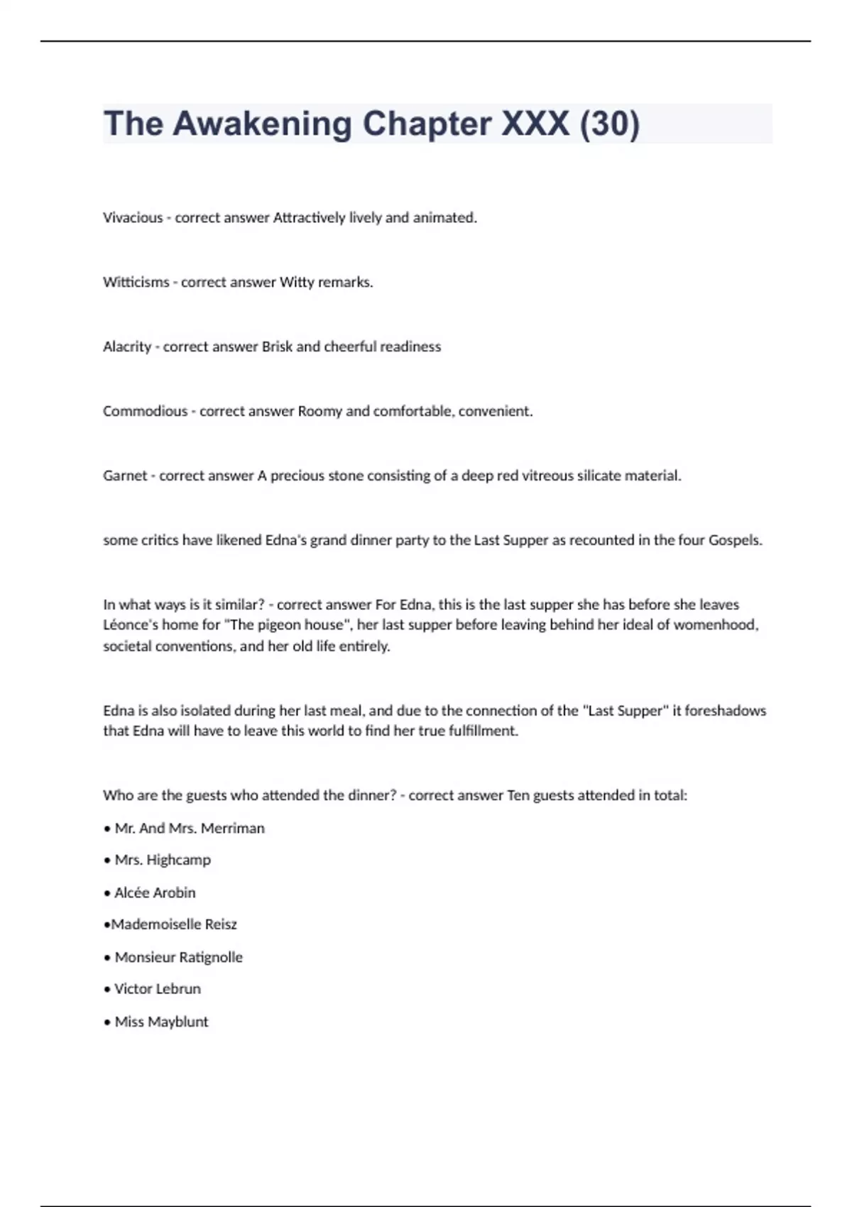 The Awakening Chapter XXX (30) Vivacious - correct answer Attractively lively and animated. Witticisms - correct answer Witty remarks. Alacrity - correct answer Brisk and cheerful readiness Commodious - correct answer Roomy and comfortable, convenient. Garnet - correct answer A precious stone consisting of a deep red vitreous silicate material. some critics have likened Edna's grand dinner party to the Last Supper as recounted in the four Gospels. In what ways is it similar? - correct answer For Edna, this is the last supper she has before she leaves Léonce's home for "The pigeon house", her last supper before leaving behind her ideal of womenhood, societal conventions, and her old life entirely. Edna is also isolated during her last meal, and due to the connection of the "Last Supper" it foreshadows that Edna will have to leave this world to find her true fulfillment. Who are the guests who attended the dinner? - correct answer Ten guests attended in total: • Mr. And Mrs. Merriman • Mrs. Highcamp • Alcée Arobin •Mademoiselle Reisz • Monsieur Ratignolle • Victor Lebrun • Miss Mayblunt • Mr. Gouvernail Who was invited but did not attend? - correct answer Madame Ratignolle and Madame Lebrun. Consider Edna's behavior at the party. Has she become an independent woman? - correct answer She has become independent, but at the cost of command and isolation. What does the following quotation indicate about the evening? "The voices of Edna's disbanding guests jarred like a discordant note upon the quiet harmony of the night". - correct answer Despite Edna's best efforts to make everything perfect (the food, the dress, the jewels, and the guests), her desperate need to control the appearance of the party stems from her feeling of helplessness. The guests are clumsy with their conversation, their interests don't align and no one listens to another. The party is a failure, not a success. How might this chapter turn out to be a climax to the story? - correct answer Mademoiselle Reisz has a suspicion about her affair with Alcée and tells her to "be good", even though it's insinuated that in the next chapter they commit adultery. This scene may also be the turning point in which Edna realizes that her independence comes at a cost.