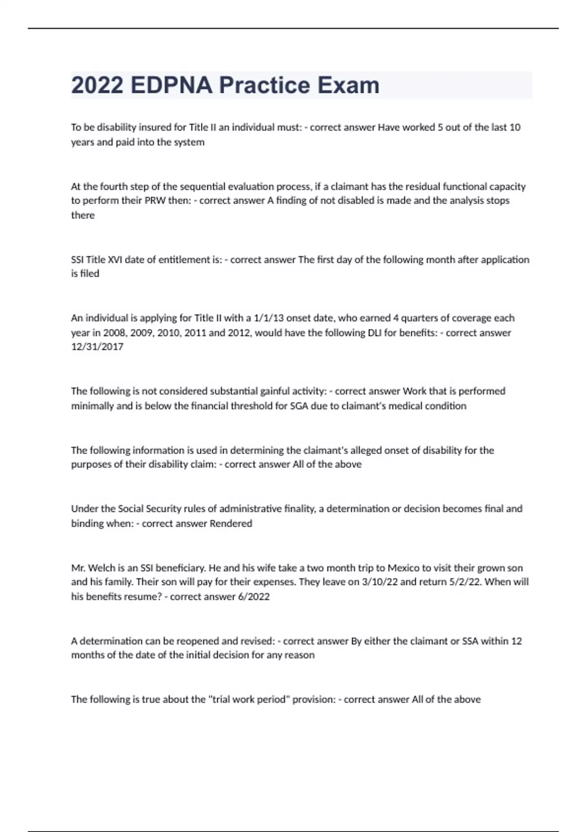 2022 EDPNA Practice ExamTo be disability insured for Title II an individual must: - correct answer Have worked 5 out of the last 10 years and paid into the system At the fourth step of the sequential evaluation process, if a claimant has the residual functional capacity to perform their PRW then: - correct answer A finding of not disabled is made and the analysis stops there SSI Title XVI date of entitlement is: - correct answer The first day of the following month after application is filed An individual is applying for Title II with a 1/1/13 onset date, who earned 4 quarters of coverage each year in 2008, 2009, 2010, 2011 and 2012, would have the following DLI for benefits: - correct answer 12/31/2017 The following is not considered substantial gainful activity: - correct answer Work that is performed minimally and is below the financial threshold for SGA due to claimant's medical condition The following information is used in determining the claimant's alleged onset of disability for the purposes of their disability claim: - correct answer All of the above Under the Social Security rules of administrative finality, a determination or decision becomes final and binding when: - correct answer Rendered Mr. Welch is an SSI beneficiary. He and his wife take a two month trip to Mexico to visit their grown son and his family. Their son will pay for their expenses. They leave on 3/10/22 and return 5/2/22. When will his benefits resume? - correct answer 6/2022 A determination can be reopened and revised: - correct answer By either the claimant or SSA within 12 months of the date of the initial decision for any reason The following is true about the "trial work period" provision: - correct answer All of the above Windfall offset applies: - correct answer When you are eligible for retroactive Social Security benefits and your SSI benefits would have been less if we paid you Social Security benefits when they were due A dedicated spending account is to be used for: - correct answer Child SSI claims past due benefits only The following would be a situation that requires the use of a fee petition to obtain representative fee: - correct answer The representative told the claimant that their fee was pro bono but changed their mind and decided after the case was approved to charge a fee for services A "determination" is: - correct answer A decision made on a case at the DDS level Res judicata would apply if: - correct answer The claimant misses the appeal deadline and files a new claim with the same onset date as the prior claim with all the same issues and facts being considered RFC is: - correct answer A claimant's maximum remaining ability after considering all of their limitations and symptoms caused by a medically determinable impairment At Step 4 of the Sequential Evaluation, RFC is used to: - correct answer Assess their ability to perform past relevant work related activities The impact of an RFC for less than a full range of sedentary work is especially critical for individuals who have not yet: - correct answer Attained age 50 To be found disabled between age 45 and 49 an individual must: - correct answer All of the above An RFC for sedentary work represents: - correct answer An individual who is significantly restricted from a wide range of physical activities which cause functional limitations to interfere with the work activity they can perform "Occasionally" is defined by SSA as: - correct answer Occurring from once up to 1/3 of the time and would generally total no more than about 2 hours within an 8 hr work day.