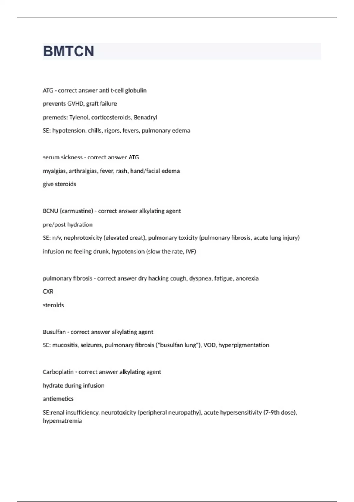 BMTCNATG - correct answer anti t-cell globulin prevents GVHD, graft failure premeds: Tylenol, corticosteroids, Benadryl SE: hypotension, chills, rigors, fevers, pulmonary edema serum sickness - correct answer ATG myalgias, arthralgias, fever, rash, hand/facial edema give steroids BCNU (carmustine) - correct answer alkylating agent pre/post hydration SE: n/v, nephrotoxicity (elevated creat), pulmonary toxicity (pulmonary fibrosis, acute lung injury) infusion rx: feeling drunk, hypotension (slow the rate, IVF) pulmonary fibrosis - correct answer dry hacking cough, dyspnea, fatigue, anorexia CXR steroids Busulfan - correct answer alkylating agent SE: mucositis, seizures, pulmonary fibrosis ("busulfan lung"), VOD, hyperpigmentation Carboplatin - correct answer alkylating agent hydrate during infusion antiemetics SE:renal insufficiency, neurotoxicity (peripheral neuropathy), acute hypersensitivity (7-9th dose), hypernatremia Cyclophosphamide - correct answer alkylating agent hydration, monitor I&O mesna SE: N/V, histamine rx, hemorrhagic cystitis (heme check, void frequently, IVF), SIADH (hyponatremia), cardiac toxicity, interstitial pneumonitis Cytarabine - correct answer antimetabolite SE: mucositis, diarrhea, chemical conjunctivitis (corticosteroid eye drops), cerebellar toxicity Etoposide - correct answer Topoisomerase II inhibitor acute anaphylactic rx with high doses (benadryl, corticosteroids) SE: mucositis, peripheral neuropathy (peds), plantar/palmar burning Fludarabine - correct answer antimetabolites SE: N/V, diarrhea ifosfamide - correct answer alkylating agent SE: encephalopathy, pulmonary toxicity, n/v Melphalan - correct answer alkylating agent cryotherapy SE: mucositis, diarrhea, typhlitis, CHF, renal toxicity Thiotepa - correct answer alkylating agent shower 2-3x day SE: mucositis, skin desquamation, pulmonary toxicity, VOD