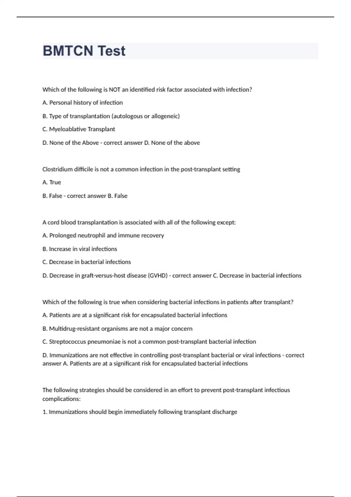BMTCN Test Which of the following is NOT an identified risk factor associated with infection? A. Personal history of infection B. Type of transplantation (autologous or allogeneic) C. Myeloablative Transplant D. None of the Above - correct answer D. None of the above Clostridium difficile is not a common infection in the post-transplant setting A. True B. False - correct answer B. False A cord blood transplantation is associated with all of the following except: A. Prolonged neutrophil and immune recovery B. Increase in viral infections C. Decrease in bacterial infections D. Decrease in graft-versus-host disease (GVHD) - correct answer C. Decrease in bacterial infections Which of the following is true when considering bacterial infections in patients after transplant? A. Patients are at a significant risk for encapsulated bacterial infections B. Multidrug-resistant organisms are not a major concern C. Streptococcus pneumoniae is not a common post-transplant bacterial infection D. Immunizations are not effective in controlling post-transplant bacterial or viral infections - correct answer A. Patients are at a significant risk for encapsulated bacterial infections The following strategies should be considered in an effort to prevent post-transplant infectious complications: 1. Immunizations should begin immediately following transplant discharge 2. Antiviral and anti-fungal prophylaxis medications should be considered in the post-transplant setting 3. Lifestyle restrictions vary in each transplant center and often are enforced to decrease post-transplant infections. It is important to communicate lifestyle expectations and restrictions to patients and their families 4. Measles, mumps, and rubella immunization should be administered at 12 months A. 1, 2, 3, 4, B. 2 and 3 C. 2 and 4 D. 2, 3, 4 - correct answer B. 2 and 3 Cardiovascular disease may be underreported in hematopoietic stem cell transplant (HSCT) recipients because symptoms may occur several months to several years following HSCT A. True B. False - correct answer A. True Which risk factors are associated with post-HSCT cardiovascular disease? 1) Hypertension, 2)Gender, 3)Certain immunosuppressive medications, 4) Previous anthracycline chemotherapy A. 1, 2, 3, 4 B. 1, 3, 4 C. 2, 3, 4 D. 1, 2, 3 - correct answer B. 1, 3, 4 The following strategies are used to manage cardiovascular disease in post HSCT patients EXCEPT: A. Antihypertensive medications B. Statin therapy