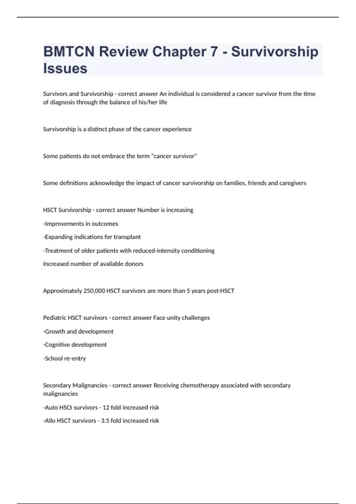 BMTCN Review Chapter 7 - Survivorship IssuesSurvivors and Survivorship - correct answer An individual is considered a cancer survivor from the time of diagnosis through the balance of his/her life Survivorship is a distinct phase of the cancer experience Some patients do not embrace the term "cancer survivor" Some definitions acknowledge the impact of cancer survivorship on families, friends and caregivers HSCT Survivorship - correct answer Number is increasing -Improvements in outcomes -Expanding indications for transplant -Treatment of older patients with reduced-intensity conditioning Increased number of available donors Approximately 250,000 HSCT survivors are more than 5 years post-HSCT Pediatric HSCT survivors - correct answer Face unity challenges -Growth and development -Cognitive development -School re-entry Secondary Malignancies - correct answer Receiving chemotherapy associated with secondary malignancies -Auto HSCt survivors - 12 fold increased risk -Allo HSCT survivors - 3.5 fold increased risk Three distinct groups of secondary malignancies -MDS and AML -PTLD's -Second solid malignancies Therapy related MDS and AML - 5%-15% of auto HSCT -Usually within 2 - 5 years -Rare in the allo HSCT setting -Refer to page 202 for specifics Post auto HSCT t-MDS - poor prognosis. -Median survival 6 months Secondary Malignancies: Incidence - correct answer PTLD is the most common second malignancy in the first year after allo HSCT using a T-cell-depleted graft Survivors > 15 years post allo HSCT have a 3-fold risk of developing a solid malignancy compared to the general population Secondary Malignancies: Risk factors - PTLD - correct answer Characteristics of the graft Preparative regimen or agents for GVHD Primary immunodeficiency; acute or extensive cGVHD; or Epstein-Barr virus (EBV) Secondary Malignancies: Causes - correct answer Alkylating agents, topoisomerase inhibitors Radiation