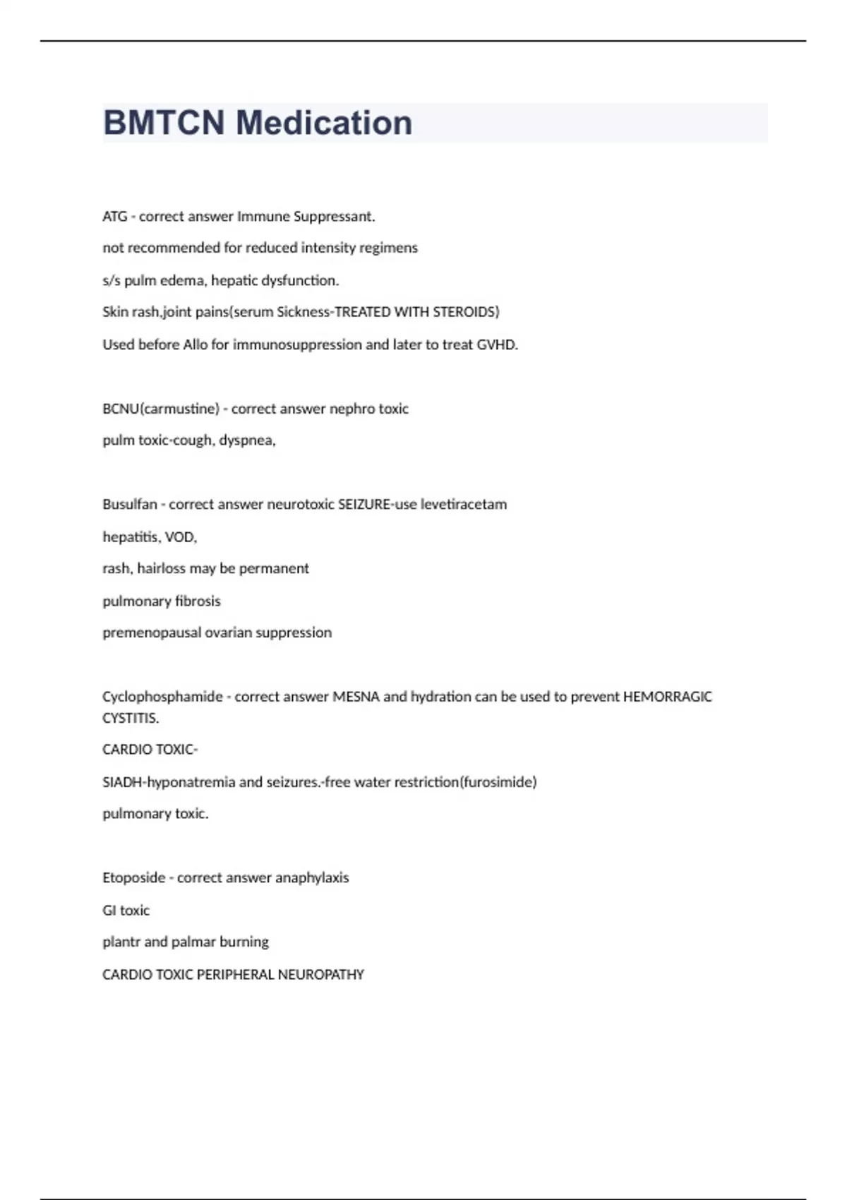 BMTCN MedicationATG - correct answer Immune Suppressant. not recommended for reduced intensity regimens s/s pulm edema, hepatic dysfunction. Skin rash,joint pains(serum Sickness-TREATED WITH STEROIDS) Used before Allo for immunosuppression and later to treat GVHD. BCNU(carmustine) - correct answer nephro toxic pulm toxic-cough, dyspnea, Busulfan - correct answer neurotoxic SEIZURE-use levetiracetam hepatitis, VOD, rash, hairloss may be permanent pulmonary fibrosis premenopausal ovarian suppression Cyclophosphamide - correct answer MESNA and hydration can be used to prevent HEMORRAGIC CYSTITIS. CARDIO TOXIC- SIADH-hyponatremia and seizures.-free water restriction(furosimide) pulmonary toxic. Etoposide - correct answer anaphylaxis GI toxic plantr and palmar burning CARDIO TOXIC PERIPHERAL NEUROPATHY Fludarabine - correct answer generally well tolerated Melphalan - correct answer pulmonary toxic. mucositis TBI - correct answer fatigue swelling of saliva glands sterility acute pneumonitis(diffuse alveolar hemorrage) CATARACTS RENAL DYSFUNCTION Carboplatin - correct answer ototoxic peripheral neuropathy cytarabine - correct answer capillary leak syndrome Trimethoprim (TMP) Sulfamethoxazole (SMX) - correct answer prophylactic used to treat PCP bacteria 6 months or longer acyclovir - correct answer antiviral used to prevent HSV ganciclovir - correct answer antiviral used to prevent CMV Fluconazole - correct answer anti-fungal used to treat Candida voriconazole and posconazole - correct answer antifungals used to prevent aspergillus CNI(cyclosporin and tacrolimus) - correct answer used to prevent GVHD