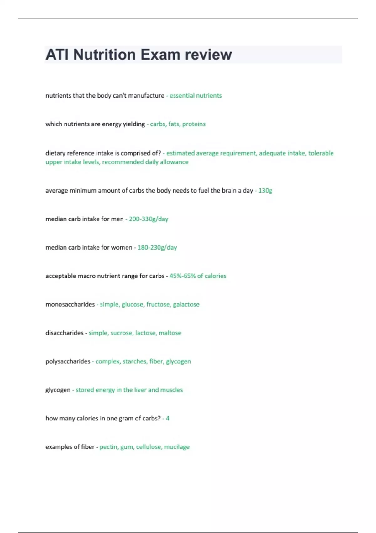 ATI Nutrition Exam review nutrients that the body can't manufacture - essential nutrients which nutrients are energy yielding - carbs, fats, proteins dietary reference intake is comprised of? - estimated average requirement, adequate intake, tolerable upper intake levels, recommended daily allowance average minimum amount of carbs the body needs to fuel the brain a day - 130g median carb intake for men - 200-330g/day median carb intake for women - 180-230g/day acceptable macro nutrient range for carbs - 45%-65% of calories monosaccharides - simple, glucose, fructose, galactose disaccharides - simple, sucrose, lactose, maltose polysaccharides - complex, starches, fiber, glycogen glycogen - stored energy in the liver and muscles how many calories in one gram of carbs? - 4 examples of fiber - pectin, gum, cellulose, mucilagefunction of monosacc - basic energy function of disacc - energy, aids in absorption of calcium and ph function of polysacc - energy storage, digestive aid (fiber) three types of protein? - complete, incomplete, complementary what factors influence the body's need for protein? - tissue growth, illness, quality of protein consumed (complete vs incomplete) daily requirement of protein for adults (%) - 10% of intake daily requirement of protein for women (g/day) - 46 daily requirement of protein for men (g/day) - 56 disorders caused by lack of protein (2) - kwashiorkor and marasmus how many calories/g does protein provide - 4 what percent of calories should come from fat - 20-35% what percentage of saturated fat is recommended? - 10% from the recommended 20-35% at least what percentage of fat in the diet is necessary to prevent wasting - 10% how many calories/g does fat provide - 9