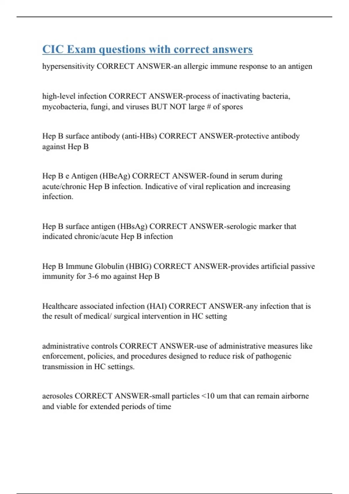 hypersensitivity CORRECT ANSWER-an allergic immune response to an antigen high-level infection CORRECT ANSWER-process of inactivating bacteria, mycobacteria, fungi, and viruses BUT NOT large # of spores Hep B surface antibody (anti-HBs) CORRECT ANSWER-protective antibody against Hep B Hep B e Antigen (HBeAg) CORRECT ANSWER-found in serum during acute/chronic Hep B infection. Indicative of viral replication and increasing infection. Hep B surface antigen (HBsAg) CORRECT ANSWER-serologic marker that indicated chronic/acute Hep B infection Hep B Immune Globulin (HBIG) CORRECT ANSWER-provides artificial passive immunity for 3-6 mo against Hep B Healthcare associated infection (HAI) CORRECT ANSWER-any infection that is the result of medical/ surgical intervention in HC setting administrative controls CORRECT ANSWER-use of administrative measures like enforcement, policies, and procedures designed to reduce risk of pathogenic transmission in HC settings.