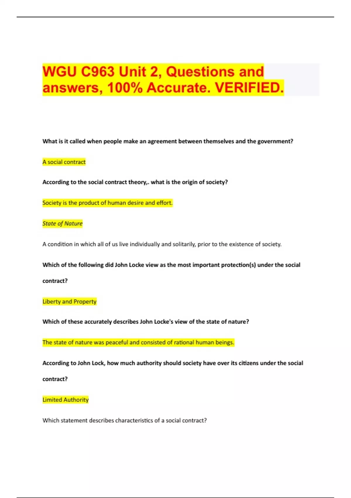 What is it called when people make an agreement between themselves and the government? A social contract According to the social contract theory,. what is the origin of society? Society is the product of human desire and effort. State of Nature A condition in which all of us live individually and solitarily, prior to the existence of society. Which of the following did John Locke view as the most important protection(s) under the social contract? Liberty and Property Which of these accurately describes John Locke's view of the state of nature?