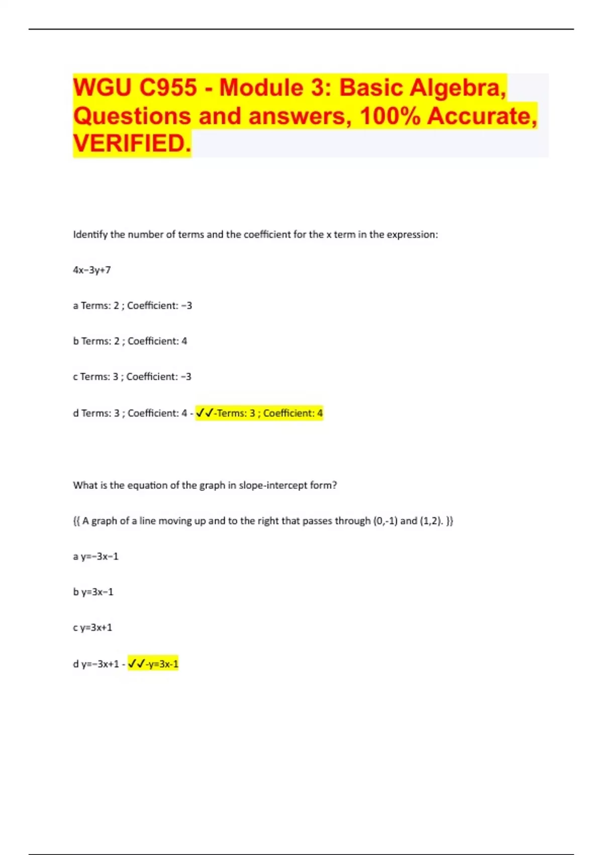 WGU C955 - Module 3: Basic Algebra, Questions and answers, 100% Accurate, VERIFIED | 24 Pages