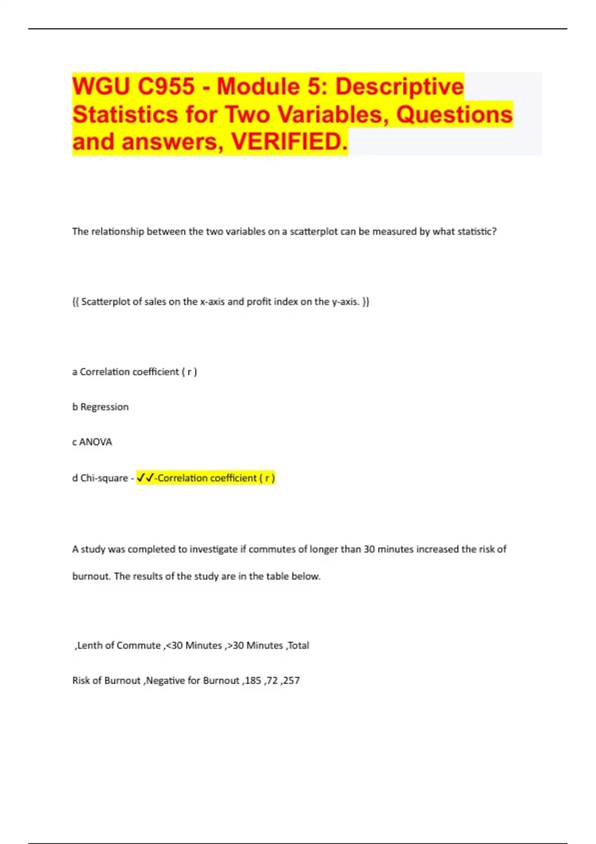 The relationship between the two variables on a scatterplot can be measured by what statistic? {{ Scatterplot of sales on the x-axis and profit index on the y-axis. }} a Correlation coefficient ( r ) b Regression c ANOVA d Chi-square - -Correlation coefficient ( r ) A study was completed to investigate if commutes of longer than 30 minutes increased the risk of burnout. The results of the study are in the table below. ,Lenth of Commute ,<30 Minutes ,>30 Minutes ,Total Risk of Burnout ,Negative for Burnout ,185 ,72 ,257