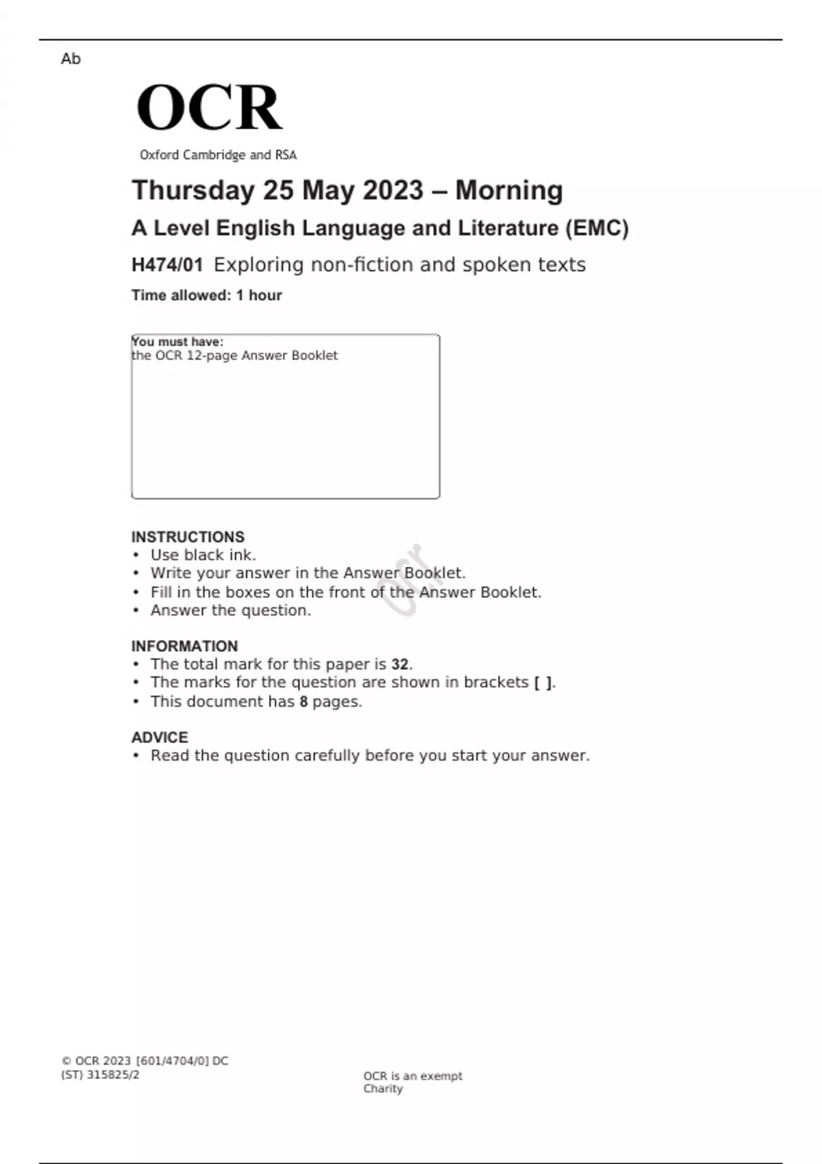 OCR A Level English Language and Literature (EMC) H474/01 JUNE 2023 QUESTION PAPER: Exploring non-fiction and spoken texts