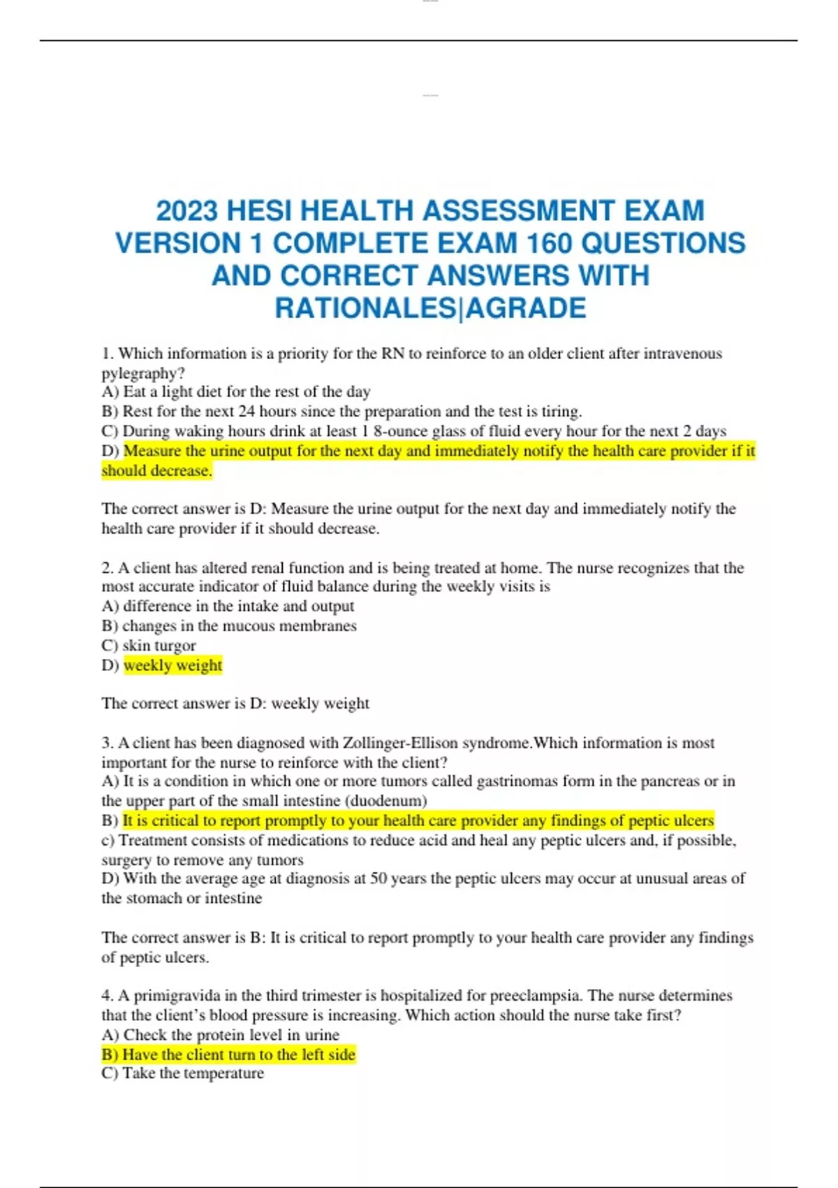 2023 HESI HEALTH ASSESSMENT EXAM VERSION 1 COMPLETE EXAM 160 QUESTIONS AND CORRECT ANSWERS WITH RATIONALES|AGRADE