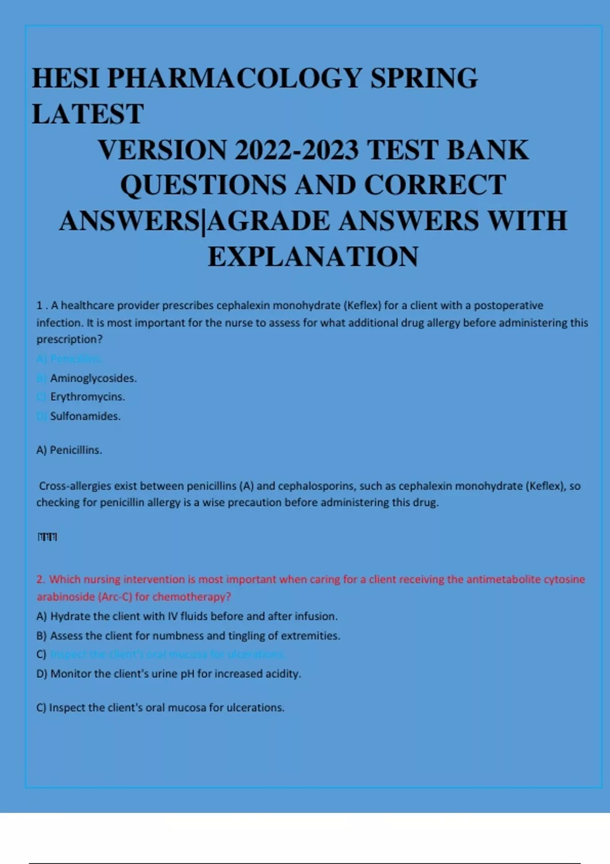 HESI PHARMACOLOGY SPRING LATEST VERSION TEST BANK QUESTIONS AND CORRECT ANSWERS|AGRADE ANSWERS WITH EXPLANATION 1 . A healthcare provider prescribes cephalexin monohydrate (Keflex) for a client with a postoperative infection. It is most important for the nurse to assess for what additional drug allergy before administering this prescription? A) Penicillins. B) Aminoglycosides. C) Erythromycins. D) Sulfonamides. A) Penicillins. Cross-allergies exist between penicillins (A) and cephalosporins, such as cephalexin monohydrate (Keflex), so checking for penicillin allergy is a wise precaution before administering this drug. 2. Which nursing intervention is most important when caring for a client receiving the antimetabolite cytosine arabinoside (Arc-C) for chemotherapy? A) Hydrate the client with IV fluids before and after infusion. B) Assess the client for numbness and tingling of extremities. C) Inspect the client's oral mucosa for ulcerations. D) Monitor the client's urine pH for increased acidity. C) Inspect the client's oral mucosa for ulcerations. Cytosine arabinoside (Arc-C) affects the rapidly growing cells of the body, therefore stomatitis and mucosal ulcerations are key signs of antimetabolite toxicity (C). (A, B, and D) are not typical interventions associated with the administration of antimetabolites. 3. When assessing an adolescent who recently overdosed on acetaminophen (Tylenol), it is most important for the nurse to assess for pain in which area of the body? A) Flank. B) Abdomen. C) Chest. D) Head. B) Abdomen. Acetaminophen toxicity can result in liver damage; therefore, it is especially important for the nurse to assess for pain in the right upper quadrant of the abdomen (B), which might indicate liver damage. (A, C, and D) are not areas where pain would be anticipated. 4. An adult client is given a prescription for a scopolamine patch (Transderm Scop) to prevent motion sickness while on a cruise. Which information should the nurse provide to the client? A) Apply the patch at least 4 hours prior to departure. B) Change the patch every other day while on the cruise. C) Place the patch on a hairless area at the base of the skull. D) Drink no more than 2 alcoholic drinks during the cruise. A) Apply the patch at least 4 hours prior to departure. Scopolamine, an anticholinergic agent, is used to prevent motion sickness and has a peak onset in 6 hours, so the client should be instructed to apply the patch at least 4 hours before departure (A) on the cruise ship. The duration of the transdermal patch is 72 hours, so (B) is not needed. Scolopamine blocks muscarinic receptors in the inner ear and to the vomiting center, so the best application site of the patch is behind the ear, not at the base of the skull (C). Anticholinergic medications are CNS depressants, so the client should be instructed to avoid alcohol (D) while using the patch. 5. The nurse is reviewing the use of the patient-controlled analgesia (PCA) pump with a client in the immediate postoperative period. The client will receive morphine 1 mg IV per hour basal rate with 1 mg IV every 15 minutes per PCA to total 5 mg IV maximally per hour. What assessment has the highest priority before initiating the PCA pump? A) The expiration date on the morphine syringe in the pump. B) The rate and depth of the client's respirations. C) The type of anesthesia used during the surgical procedure. D) The client's subjective and objective signs of pain. B) The rate and depth of the client's respirations. A life-threatening side effect of intravenous administration of morphine sulfate, an opiate narcotic, is respiratory depression (B). The PCA pump should be stopped and the healthcare provider notified if the client's respiratory rate falls below 12 breaths per minute, and the nurse should anticipate adjustments in the client's dosage before the PCA pump is restarted. (A, C, and D) provide helpful information, but are not as high a priority as the assessment described in (B). 6. A medication that is classified as a beta-1 agonist is most commonly prescribed for a client with which condition? A) Glaucoma. B) Hypertension. C) Heart failure. D) Asthma. C) Heart failure. Beta-1 agonists improve cardiac output by increasing the heart rate and blood pressure and are indicated in heart failure (C), shock, atrioventricular block dysrhythmias, and cardiac arrest. Glaucoma (A) is managed using adrenergic agents and beta-adrenergic blocking agents. Beta-1 blocking agents are used in the management of hypertension (B). Medications that stimulate beta-2 receptors in the bronchi are effective for bronchoconstriction in respiratory disorders, such as asthma (D). 7. A female client with rheumatoid arthritis take ibuprofen (Motrin) 600 mg PO 4 times a day. To prevent gastrointestinal bleeding, misoprostol (Cytotec) 100 mcg PO is prescribed. Which information is most important for the nurse to include in client teaching? A) Use contraception during intercourse. B) Ensure the Cytotec is taken on an empty stomach. C) Encourage oral fluid intake to prevent constipation. D) Take Cytotec 30 minutes prior to Motrin. A) Use contraception during intercourse. Cytotec, a synthetic form of a prostaglandin, is classified as pregnancy Category X and can act as an abortifacient, so the client should be instructed to use contraception during intercourse (A) to prevent loss of an early pregnancy. (B) is not necessary. A common side effect of Cytotec is diarrhea, so constipation prevention strategies are usually not needed (C). Cytotec and Motrin should be taken together (D) to provide protective properties against gastrointestinal bleeding.