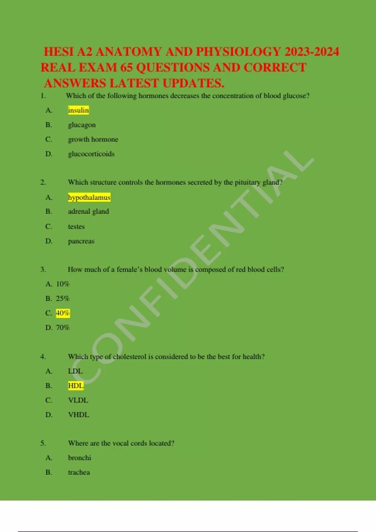 HESI A2 ANATOMY AND PHYSIOLOGY REAL EXAM 65 QUESTIONS AND CORRECT ANSWERS LATEST UPDATES. 1. Which of the following hormones decreases the concentration of blood glucose? A. insulin B. glucagon C. growth hormone D. glucocorticoids 2. Which structure controls the hormones secreted by the pituitary gland? A. hypothalamus B. adrenal gland C. testes D. pancreas 3. How much of a female’s blood volume is composed of red blood cells? A. 10% B. 25% C. 40% D. 70% 4. Which type of cholesterol is considered to be the best for health? A. LDL B. HDL C. VLDL D. VHDL 5. Where are the vocal cords located? A. bronchi B. trachea C. larynx D. epiglottis 6. Where does gas exchange occur in the human body? A. alveoli B. bronchi C. larynx D. pharynx 7. What mineral is responsible for muscle contractions? A. Chloride B. Sodium C. Calcium D. Magnesium 8. In which of the following locations would the urinary bladder and internal reproductive organs be found? A. Thoracic cavity B. Mediastinum C. Abdominal cavity D. Pelvic cavity 9. What separates the thoracic cavity from the abdominal cavity? A. Diaphragm B. Mediastinum C. Liver D. Lungs 10. Which of the following epithelial types is correctly matched with its major function? A. Simple squamous epithelium—secretion or absorption B. Stratified squamous epithelium—changes shape when stretched C. Stratified squamous epithelium—diffusion D. Simple columnar epithelium—secretion or absorption 11. A tissue examined under the microscope exhibits the following characteristics: cells found on internal surface of stomach, no extracellular matrix, cells tall and thin, no blood vessels in the tissue. What type of tissue is this? A. Epithelial B. Connective C. Muscle D. Cartilage E. Nervou