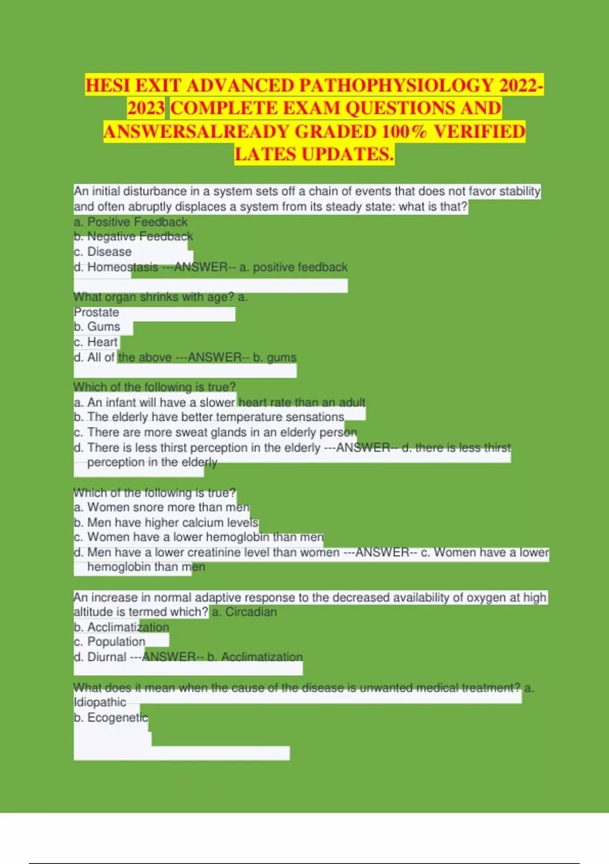 HESI EXIT ADVANCED PATHOPHYSIOLOGY 2022- 2023 COMPLETE EXAM QUESTIONS AND ANSWERSALREADY GRADED 100% VERIFIED LATES UPDATES. An initial disturbance in a system sets off a chain of events that does not favor stability and often abruptly displaces a system from its steady state: what is that? a. Positive Feedback b. Negative Feedback c. Disease d. Homeostasis ---ANSWER-- a. positive feedback What organ shrinks with age? a. Prostate b. Gums c. Heart d. All of the above ---ANSWER-- b. gums Which of the following is true? a. An infant will have a slower heart rate than an adult b. The elderly have better temperature sensations c. There are more sweat glands in an elderly person d. There is less thirst perception in the elderly ---ANSWER-- d. there is less thirst perception in the elderly Which of the following is true? a. Women snore more than men b. Men have higher calcium levels c. Women have a lower hemoglobin than men d. Men have a lower creatinine level than women ---ANSWER-- c. Women have a lower hemoglobin than men An increase in normal adaptive response to the decreased availability of oxygen at high altitude is termed which? a. Circadian b. Acclimatization c. Population d. Diurnal ---ANSWER-- b. Acclimatization What does it mean when the cause of the disease is unwanted medical treatment? a. Idiopathic b. Ecogenetic c. Genotypical d. Iatrogenic ---ANSWER-- d. Iatrogenic Which term is used for the first two months of life? a. Infancy b. Childhood c. Prenatal d. Neonatal ---ANSWER-- d. Neonatal Which is an objectively identifiable aberration of the disease? a. Symptom b. Syndrome c. Stage d. Sign ---ANSWER-- d. Sign Which of the following is true regarding catecholamines? a. They are from the parasympathetic nervous system b. They cross the blood brain barrier c. They include epinephrine and norepinephrine d. They cause of decrease in heart rate ---ANSWER-- c. They include epinephrine and norepinephrine Which of the following is a true statement? a. Antidiuretic hormone is not important for blood volume regulation b. Endorphins increase with stress, resulting in a decrease in pain perception c. Epinephrine and cortisol act very differently d. Cortisol negates epinephrine's activity ---ANSWER-- b. Endorphins increase with stress, resulting in a decrease in pain perception By what mechanism do lipid molecules cross cell membranes? a. They use channel proteins as a membrane transport system b. They are transported across the plasma membrane by endocytosis and exocytosis c. They use voltage-gated ion channels d. They cross by diffusion ---ANSWER-- d. They cross by diffusion Which of the following metabolic processes is a component of anabolic metabolism? a. Protein synthesis b. Glycolysis c. Citric acid cycle d. Oxidative phosphorylation ---ANSWER-- a. Protein synthesis Which of the following electrochemical mechanism is responsible for maintaining cell volume? a. The calcium pump b. Glucose transporters c. The sodium-potassium pump d. ATP-binding cassette (ABC) transporters ---ANSWER-- c. The sodium-potassium pump Cellular hypoxia results in: a. Enhanced ATP activity b. Loss of intracellular calcium c. Increased pH d. Failure of the sodium-potassium pump ---ANSWER-- d. Failure of the sodiumpotassium pump A 75 yo woman develops weakness in her lower extremities after a prolonged period of bed rest. This is most likely caused by: a. Atrophy of her leg muscles b. Dysplasia of her leg muscles c. Hypertrophy of her leg muscles d. Hyperplasia of her leg muscles ---ANSWER-- a. Atrophy of her leg muscles Which of the following types of cellular adaption is most likely to occur from chronic