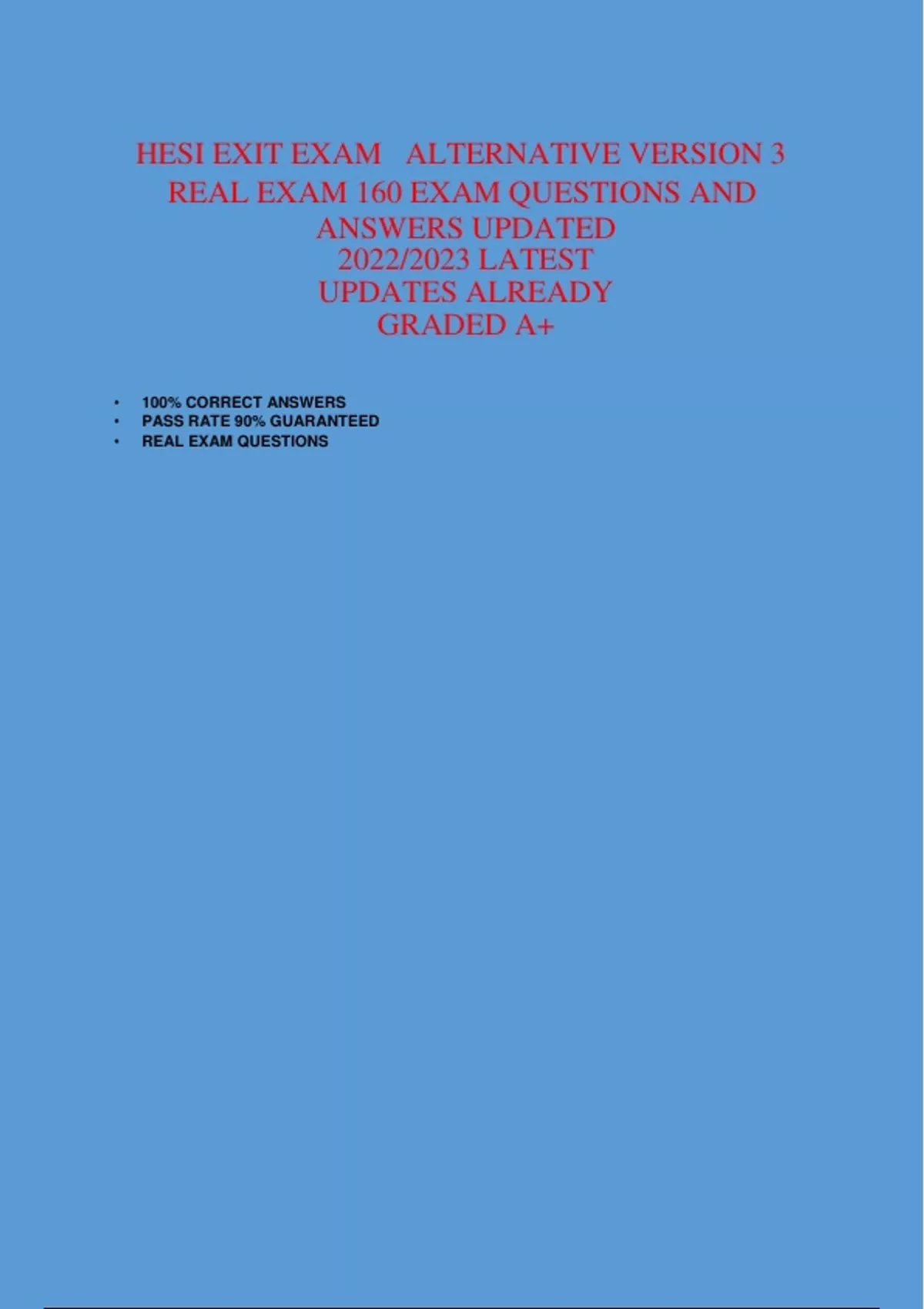 HESI EXIT EXAM ALTERNATIVE VERSION 3 REAL EXAM 160 EXAM QUESTIONS AND ANSWERS UPDATED 2022/2023 LATEST UPDATES ALREADY GRADED A+