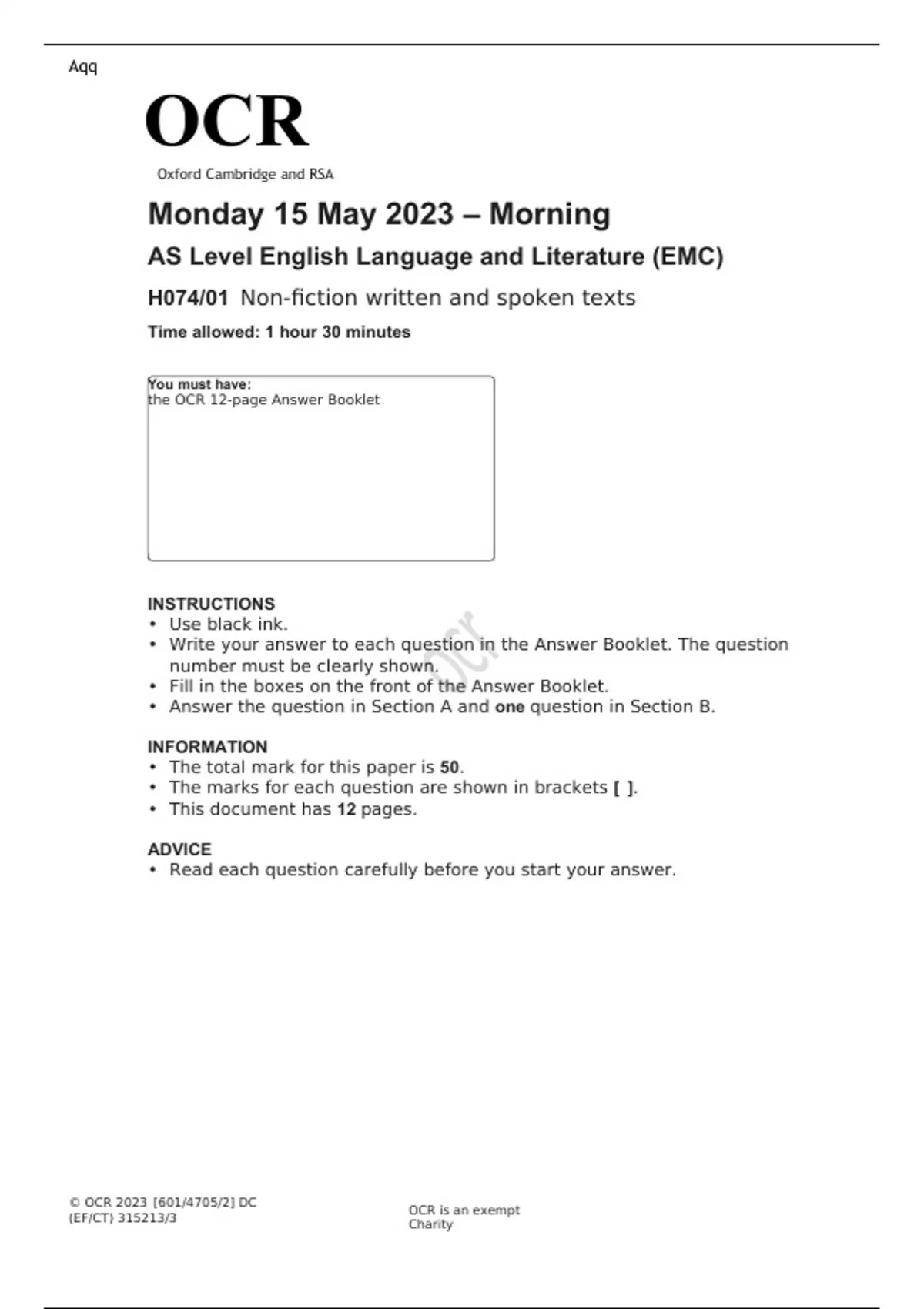 OCR AS Level English Language and Literature (EMC) H074/01 JUNE 2023 QUESTION PAPER: Non-fiction written and spoken texts