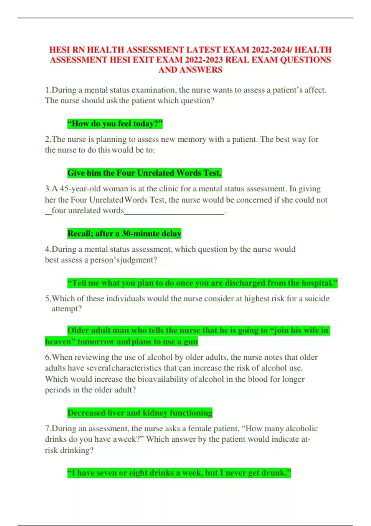 HESI RN HEALTH ASSESSMENT LATEST EXAM / HEALTH ASSESSMENT HESI EXIT EXAM REAL EXAM QUESTIONS AND ANSWERS 1.During a mental status examination, the nurse wants to assess a patient’s affect. The nurse should askthe patient which question? “How do you feel today?” 2.The nurse is planning to assess new memory with a patient. The best way for the nurse to do thiswould be to: Give him the Four Unrelated Words Test. 3.A 45-year-old woman is at the clinic for a mental status assessment. In giving her the Four UnrelatedWords Test, the nurse would be concerned if she could not four unrelated words . Recall; after a 30-minute delay 4.During a mental status assessment, which question by the nurse would best assess a person’sjudgment? “Tell me what you plan to do once you are discharged from the hospital.” 5.Which of these individuals would the nurse consider at highest risk for a suicide attempt? Older adult man who tells the nurse that he is going to “join his wife in heaven” tomorrow andplans to use a gun 6.When reviewing the use of alcohol by older adults, the nurse notes that older adults have severalcharacteristics that can increase the risk of alcohol use. Which would increase the bioavailability ofalcohol in the blood for longer periods in the older adult? Decreased liver and kidney functioning 7.During an assessment, the nurse asks a female patient, “How many alcoholic drinks do you have aweek?” Which answer by the patient would indicate atrisk drinking? “I have seven or eight drinks a week, but I never get drunk.” 8.The nurse is asking an adolescent about illicit substance abuse. The adolescent answers, “Yes, I’veused marijuana at parties with my friends.” What is the next question the nurse should ask? “When was the last time you used marijuana?” 9.The nurse has completed an assessment on a patient who came to the clinic for a leg injury. As a resultof the assessment, the nurse has determined that the patient has at-risk alcohol use. Which action by the nurse is most appropriate at this time? State, “You are drinking more than is medically safe. I strongly recommend that you quitdrinking, and I’m willing to help you.” 10. A patient is brought to the emergency department. He is restless, has dilated pupils, is sweating, hasa runny nose and tearing eyes, and complains of muscle and joint pains. His girlfriend thinks he has influenza, but she became concerned when his temperature went up to 39.4° C. She admits that he has been a heavy drug user, but he has been trying to stop on his own. The nurse suspects that the patient isexperiencing withdrawal symptoms from which substance? Heroin 11. Patient taking ipratropium reports nausea, blurred vision, has, insomnia after using the inhaler. RNaction to implement - withhold med and report symptoms 12. A patient has suddenly developed shortness of breath and appears to be in significant respiratory distress. After calling the physician and placing the patient on oxygen, which of these actions is the bestfor the nurse to take when further assessing the patient? Bilaterally percuss the thorax, noting any differences in percussion tones. 13. The nurse is teaching a class on basic assessment skills. Which of these statements is true regardingthe stethoscope and its use? Although the stethoscope does not magnify sound, it does block out extraneous room noise. 14. The nurse is preparing to use a stethoscope for auscultation. Which statement is true regarding thediaphragm of the stethoscope? The diaphragm: Is used to listen for high-pitched sounds. 15. Before auscultating the abdomen for the presence of bowel sounds on a patient, the nurse should: Check the temperature of the room, and offer blankets to the patient if he or she feels cold. 16. While measuring a patient’s blood pressure, the nurse recalls that certain factors, such as , help determine blood pressure. Peripheral vascular resistance 17. A nurse is helping at a health fair at a local mall. When taking blood pressures on a variety of people,the nurse keeps in mind that: The blood pressure of a Black adult is usually higher than that of a White adult of the same age. 8. The nurse notices a colleague is preparing to check the blood pressure of a patient who is obese byusing a standard-sized blood pressure cuff. The nurse should expect the reading to: Yield a falsely high blood pressure. 19. A student is late for his appointment and has rushed across campus to the health clinic. The nurseshould: Allow 5 minutes for him to relax and rest before checking his vital signs