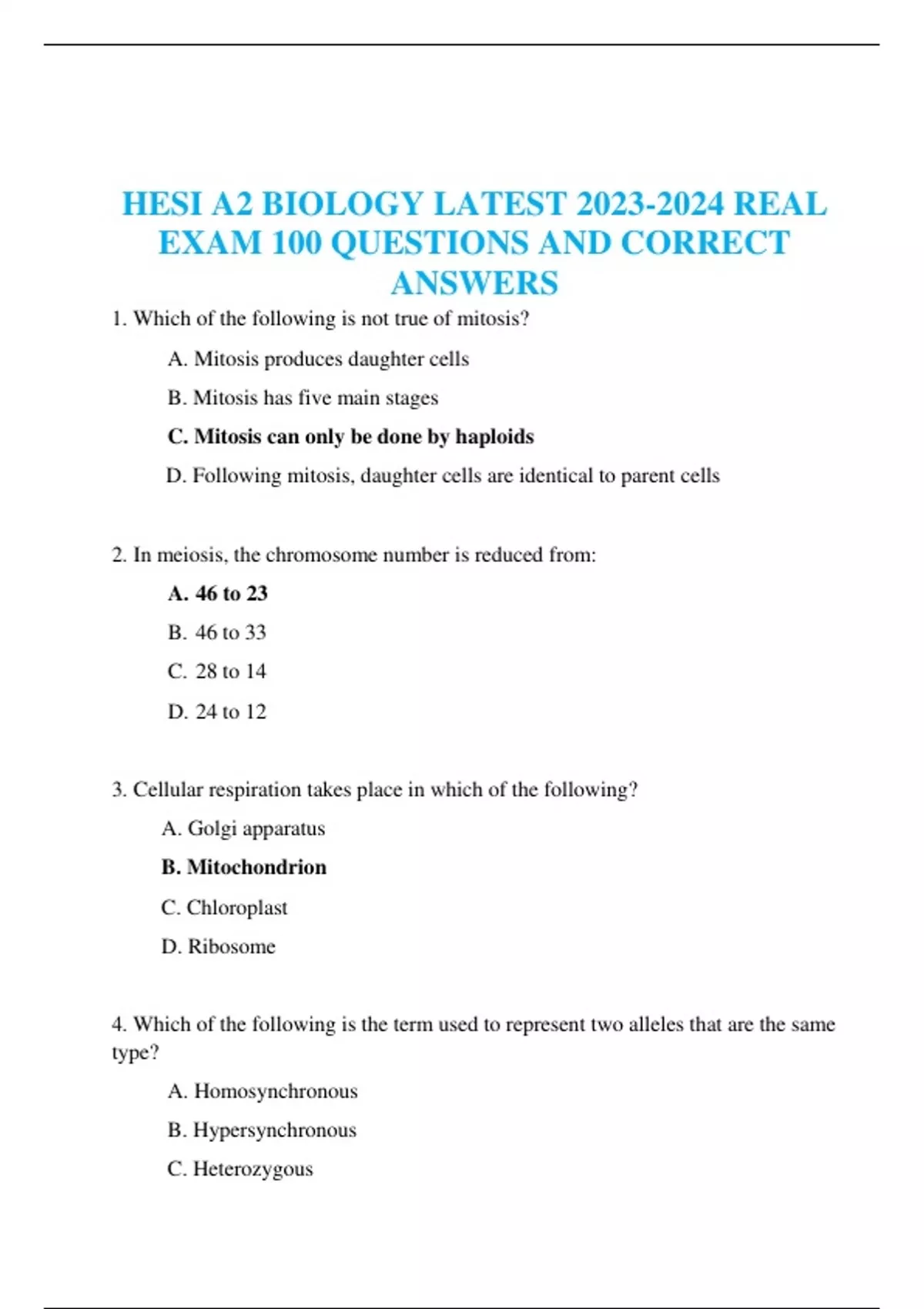 HESI A2 BIOLOGY LATEST REAL EXAM 100 QUESTIONS AND CORRECT ANSWERS 1. Which of the following is not true of mitosis? A. Mitosis produces daughter cells B. Mitosis has five main stages C. Mitosis can only be done by haploids D. Following mitosis, daughter cells are identical to parent cells 2. In meiosis, the chromosome number is reduced from: A. 46 to 23 B. 46 to 33 C. 28 to 14 D. 24 to 12 3. Cellular respiration takes place in which of the following? A. Golgi apparatus B. Mitochondrion C. Chloroplast D. Ribosome 4. Which of the following is the term used to represent two alleles that are the same type? A. Homosynchronous B. Hypersynchronous C. Heterozygous D. Homozygous The Punnett square shows that one parent carries the recessive gene for a cleft chin (c) while the other parent does not. 5. What percentage of the parents' offspring is predicted to have a cleft chin? A. 25% B. 50% C. 0% D. 75% 6. Which of the following options identifies the products of cell respiration? A. Water, carbon dioxide, and oxygen B. Glucose and oxygen C. Water, carbon dioxide, and adenosine triphosphate (ATP) D. Water, glucose, and oxygen 7. Which stage of mitosis is occurring when the nuclear envelope begins to disappear and the chromosomes begin to attach to the spindle that is forming along the axis of the cell? A. Prometaphase B. Metaphase C. Anaphase D. Prophase 8. In the hierarchic organizational system, which of these is the most restrictive category? A. Genus B. Class C. Kingdom D. Species 9. Water is a polar molecule that can be: A. cohesive and corrosive B. cohesive and adhesive C. electrostatic and ionic D. repellent and attractive