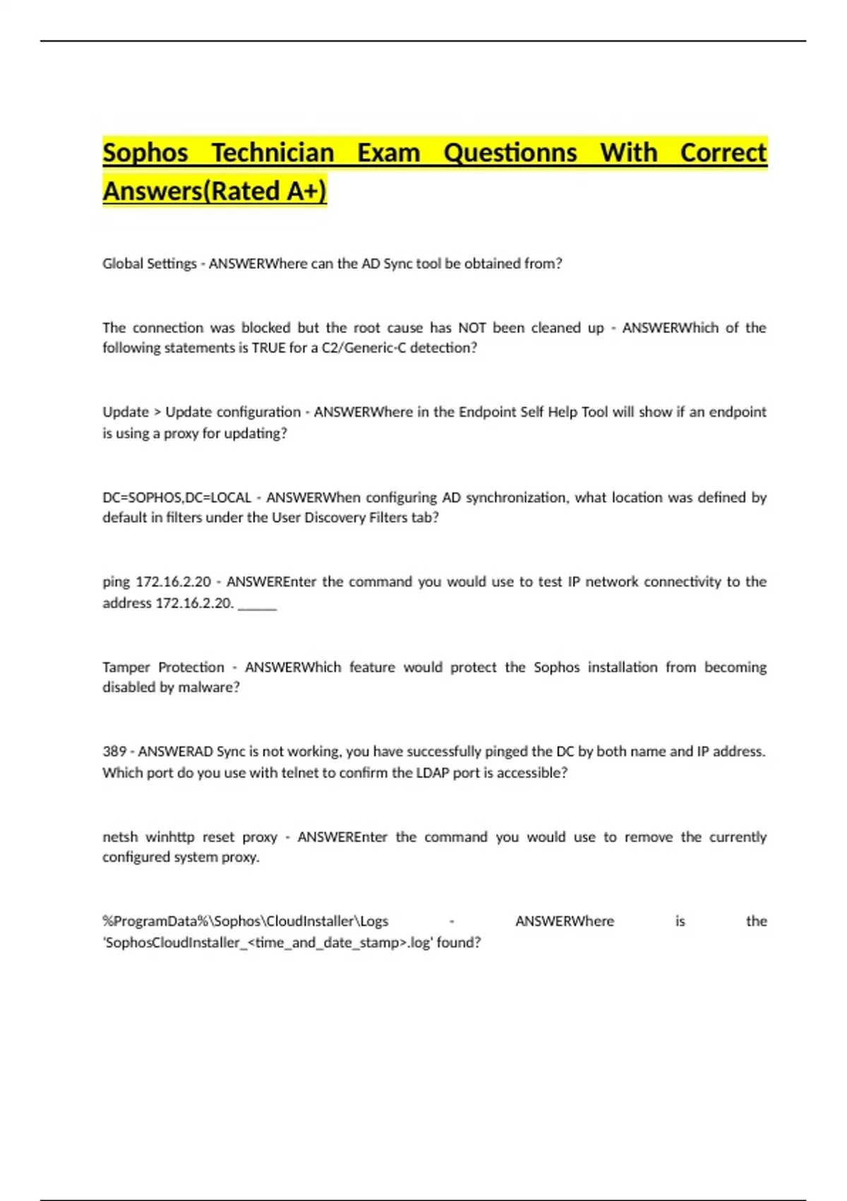 Global Settings - ANSWERWhere can the AD Sync tool be obtained from? The connection was blocked but the root cause has NOT been cleaned up - ANSWERWhich of the following statements is TRUE for a C2/Generic-C detection? Update > Update configuration - ANSWERWhere in the Endpoint Self Help Tool will show if an endpoint is using a proxy for updating? DC=SOPHOS,DC=LOCAL - ANSWERWhen configuring AD synchronization, what location was defined by default in filters under the User Discovery Filters tab? ping 172.16.2.20 - ANSWEREnter the command you would use to test IP network connectivity to the address 172.16.2.20. _____ Tamper Protection - ANSWERWhich feature would protect the Sophos installation from becoming disabled by malware? 389 - ANSWERAD Sync is not working, you have successfully pinged the DC by both name and IP address. Which port do you use with telnet to confirm the LDAP port is accessible? netsh winhttp reset proxy - ANSWEREnter the command you would use to remove the currently configured system proxy.