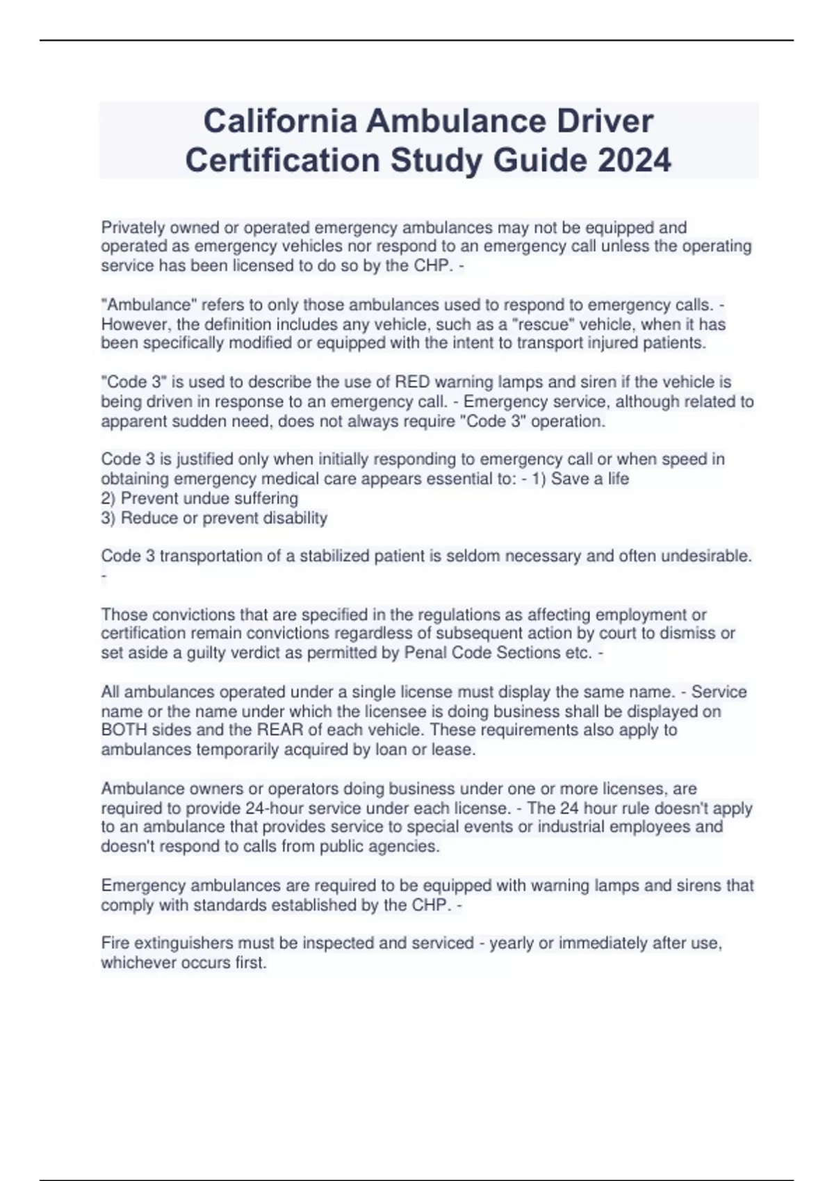 Privately owned or operated emergency ambulances may not be equipped and operated as emergency vehicles nor respond to an emergency call unless the operating service has been licensed to do so by the CHP. - "Ambulance" refers to only those ambulances used to respond to emergency calls. - However, the definition includes any vehicle, such as a "rescue" vehicle, when it has been specifically modified or equipped with the intent to transport injured patients. "Code 3" is used to describe the use of RED warning lamps and siren if the vehicle is being driven in response to an emergency call. - Emergency service, although related to apparent sudden need, does not always require "Code 3" operation. Code 3 is justified only when initially responding to emergency call or when speed in obtaining emergency medical care appears essential to: - 1) Save a life 2) Prevent undue suffering 3) Reduce or prevent disability Code 3 transportation of a stabilized patient is seldom necessary and often undesirable. - Those convictions that are specified in the regulations as affecting employment or certification remain convictions regardless of subsequent action by court to dismiss or set aside a guilty verdict as permitted by Penal Code Sections etc. - All ambulances operated under a single license must display the same name. - Service name or the name under which the licensee is doing business shall be displayed on BOTH sides and the REAR of each vehicle. These requirements also apply to ambulances temporarily acquired by loan or lease. Ambulance owners or operators doing business under one or more licenses, are required to provide 24-hour service under each license. - The 24 hour rule doesn't apply to an ambulance that provides service to special events or industrial employees and doesn't respond to calls from public agencies. Emergency ambulances are required to be equipped with warning lamps and sirens that comply with standards established by the CHP. - Fire extinguishers must be inspected and serviced - yearly or immediately after use, whichever occurs first. Licensee's vehicles are all required to be inspected initially and annually thereafter by CHP personnel. - Random inspections will also be made to verify that the vehicles are maintained in compliance with applicable requirements. "Good Samaritan" laws provide limited protection from civl liability under specified circumstances when rendering emergency medical services in good faith. - Ambulance services and personnel may be civilly liable for acts or omissions performed in a grossly negligent manner or not performed in good faith. Negligence and lack of good faith is determined by judge or jury. CHP cannot grant exemptions to statutory requirements or regulations of other agencies. - Ambulance driver certificates are not required for the following: - 1) Persons driving ambulances in the line of duty as salaried, regular, full-time, police officers, deputy sheriffs, or members of a fire department of a public agency. 2) Persons driving ambulances from out of state, into California, to provide only interstate emergency service, if the drivers are appropriately licensed or certified by the state of origin. Ambulance driver certificate renewal application fee is - $12 All convictions, including those that were set aside, dismissed, or expunged, MUST be declared regardless of court relief. - Failure to declare ALL criminal convictions, whether felony or misdemeanor, or a false statement on application may cause certificate to be denied. No certificate will be issued within ____ months of a denial resulting from a deliberate misrepresentation of material facts. - 12 Temporary certificate becomes void ____ days from date of issuance. - 180 The regular ambulance certificate is issued for a term not to exceed ____ years and will expire on the same date as applicant's driver license. - 5 The ambulance driver certificate is valid only when accompanied by valid driver's license and medical examination certificate which was issued within preceding two years and approved by DMV. - Additionally, after 1 year after initial employment as an ambulance driver, the driver must also possess an EMT certificate or other certificate or license evidencing compliance with training standards required for ambulance attendants. Renewal applications will be accepted during _____ month period prior to expiration of the previous certificate. - 6