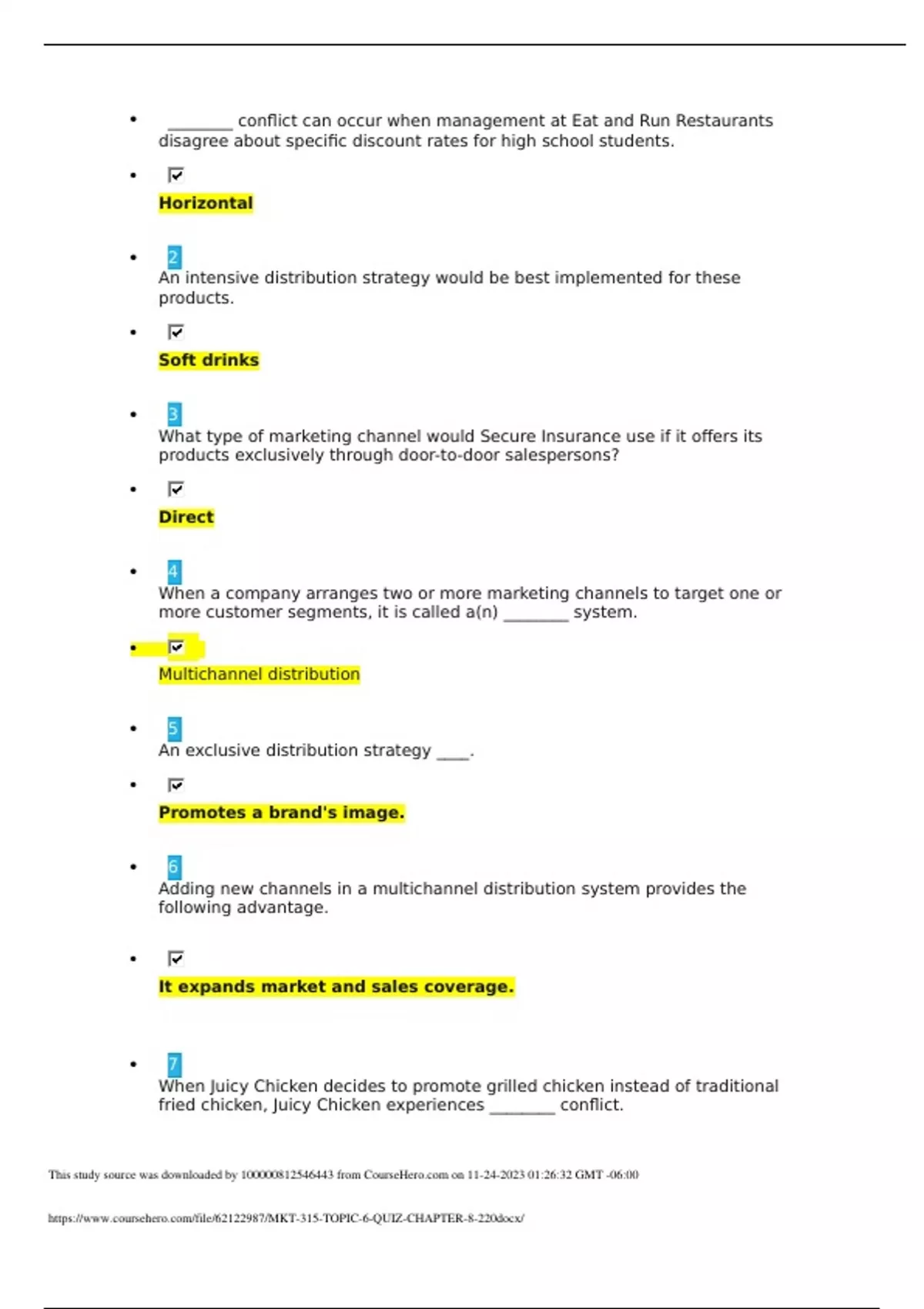 ________ conflict can occur when management at Eat and Run Restaurants disagree about specific discount rates for high school students. Horizontal 2 An intensive distribution strategy would be best implemented for these products. Soft drinks 3 What type of marketing channel would Secure Insurance use if it offers its products exclusively through door-to-door salespersons? Direct 4 When a company arranges two or more marketing channels to target one or more customer segments, it is called a(n) ________ system. Multichannel distribution 5 An exclusive distribution strategy ____. Promotes a brand's image. 6 Adding new channels in a multichannel distribution system provides the following advantage. It expands market and sales coverage. 7 When Juicy Chicken decides to promote grilled