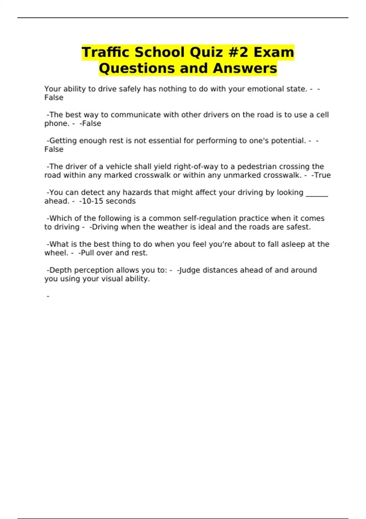 Traffic School Quiz #2 Exam Questions and Answers