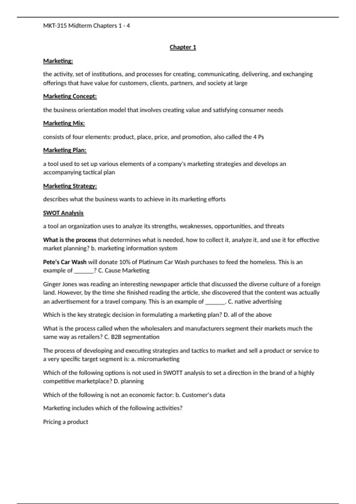 MKT-315 Midterm Chapters 1 - 4 Chapter 1 Marketing: the activity, set of institutions, and processes for creating, communicating, delivering, and exchanging offerings that have value for customers, clients, partners, and society at large Marketing Concept: the business orientation model that involves creating value and satisfying consumer needs Marketing Mix: consists of four elements: product, place, price, and promotion, also called the 4 Ps Marketing Plan: a tool used to set up various elements of a company's marketing strategies and develops an accompanying tactical plan Marketing Strategy: describes what the business wants to achieve in its marketing efforts SWOT Analysis a tool an organization uses to analyze its strengths, weaknesses, opportunities, and threats What is the process that determines what is needed, how to collect it, analyze it, and use it for effective market planning? b. marketing information system Pete's Car Wash will donate 10% of Platinum Car Wash purchases to feed the homeless. This is an example of ______? C. Caus