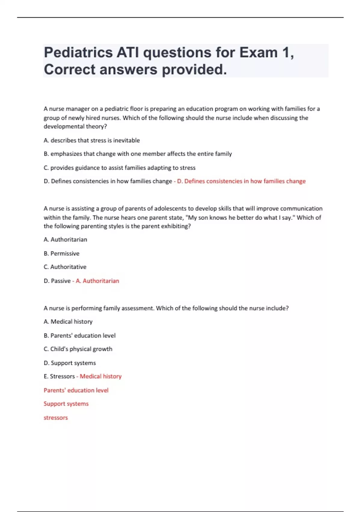 Pediatrics ATI questions for Exam 1, Correct answers provided. A nurse manager on a pediatric floor is preparing an education program on working with families for a group of newly hired nurses. Which of the following should the nurse include when discussing the developmental theory? A. describes that stress is inevitable B. emphasizes that change with one member affects the entire family C. provides guidance to assist families adapting to stress D. Defines consistencies in how families change - D. Defines consistencies in how families change A nurse is assisting a group of parents of adolescents to develop skills that will improve communication within the family. The nurse hears one parent state, "My son knows he better do what I say." Which of the following parenting styles is the parent exhibiting? A. Authoritarian B. Permissive C. Authoritative D. Passive - A. Authoritarian A nurse is performing family assessment. Which of the following should the nurse include? A. Medical history B. Parents' education level C. Child's physical growth D. Support systems E. Stressors - Medical history Parents' education level Support systems stressorsA nurse is preparing to assess a preschool-age child. Which of the following is an appropriate action? A. Allow the child to role-play using mini equipment B. Use medical terminology to describe what will happen. C. Separate the child from her parent during the examination D. Keep medical equipment visible to the child - Allow the child to role-play using miniature equipment A nurse is checking the vital signs of 3-year-old child during a well-child visit. Which of the following findings should the nurse report to the provider Temperature 37.2 HR 106 Resp 30 BP 88/54 - Resp 30 A nurse is assessing a child's ears. Which of the following is an expected finding light reflex is located at 2 oclock position tympanic membrane is red in color bony landmarks are not visible cerumen is present bilaterally - Cerumen is present bilaterally A nurse is assessing a 6 mo old infant which of the following reflexes should the infant exhibit - plantar grasp A nurse is performing a neuro assessment on an adolescent. Which of the following is an appropriate reaction by the adolescent when the nurse checks the trigeminal cranial nerve? clenching teeth together tightly recognizing sour tastes on the back of the tongue identifying smells through each nostril Detecting facial touches with eyes closed Looking down and in with the eyes - Clenching teeth together tightly Detecting facial touches with eyes closed