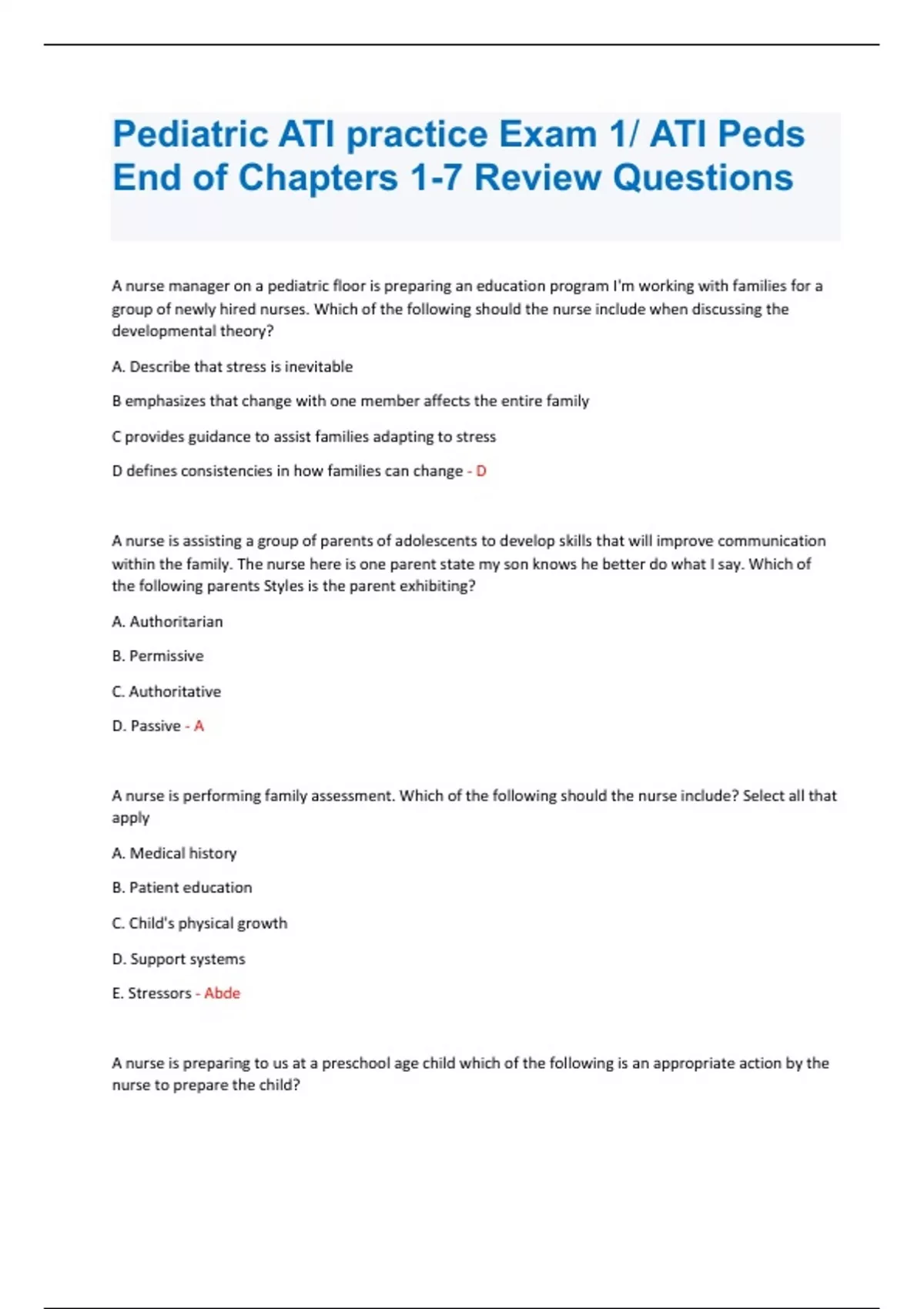 Pediatric ATI practice Exam 1/ ATI Peds End of Chapters 1-7 Review Questions A nurse manager on a pediatric floor is preparing an education program I'm working with families for a group of newly hired nurses. Which of the following should the nurse include when discussing the developmental theory? A. Describe that stress is inevitable B emphasizes that change with one member affects the entire family C provides guidance to assist families adapting to stress D defines consistencies in how families can change - D A nurse is assisting a group of parents of adolescents to develop skills that will improve communication within the family. The nurse here is one parent state my son knows he better do what I say. Which of the following parents Styles is the parent exhibiting? A. Authoritarian B. Permissive C. Authoritative D. Passive - A A nurse is performing family assessment. Which of the following should the nurse include? Select all that apply A. Medical history B. Patient education C. Child's physical growth D. Support systems E. Stressors - Abde A nurse is preparing to us at a preschool age child which of the following is an appropriate action by the nurse to prepare the child?A. Allow the child to role play using miniature equipment Be. Used medical terminology to describe what will happen C. Separate the child from her parents during the examination D. Keep medical equipment visible to the child - A A nurse is checking the vital signs of a 3 year old child during a well child visit. Which of the following findings should the nurse report to the provider? A. temperature 37. 2 degrees Celsius B. Pulse 114 C. Respirations 30 D. Blood pressure 88/ 55 - c A nurse is assessing a child's ears. Which of the following is an expected finding? A. Light reflex is located at the 2 o'clock position B. Tympanic membrane is red in color C. Bony landmarks are not visible D. Cerumen is present bilaterally - D And nurse is assessing a 6 month old infant. Which of the following reflexes should exist? A. Moro B. Plantar grasp C. Stepping D. Tonic neck - B a nurse is performing a neurological assessment on an adolescent. Which of the following is an appropriate reaction by the adolescent when the nurse checks the trigeminal cranial nerve? Select all that apply A. Clenching teeth together tightly B. Recognizing sour taste on the back of the tongue c. Identifying smells through each nostril D. Detecting facial touches with eyes closed