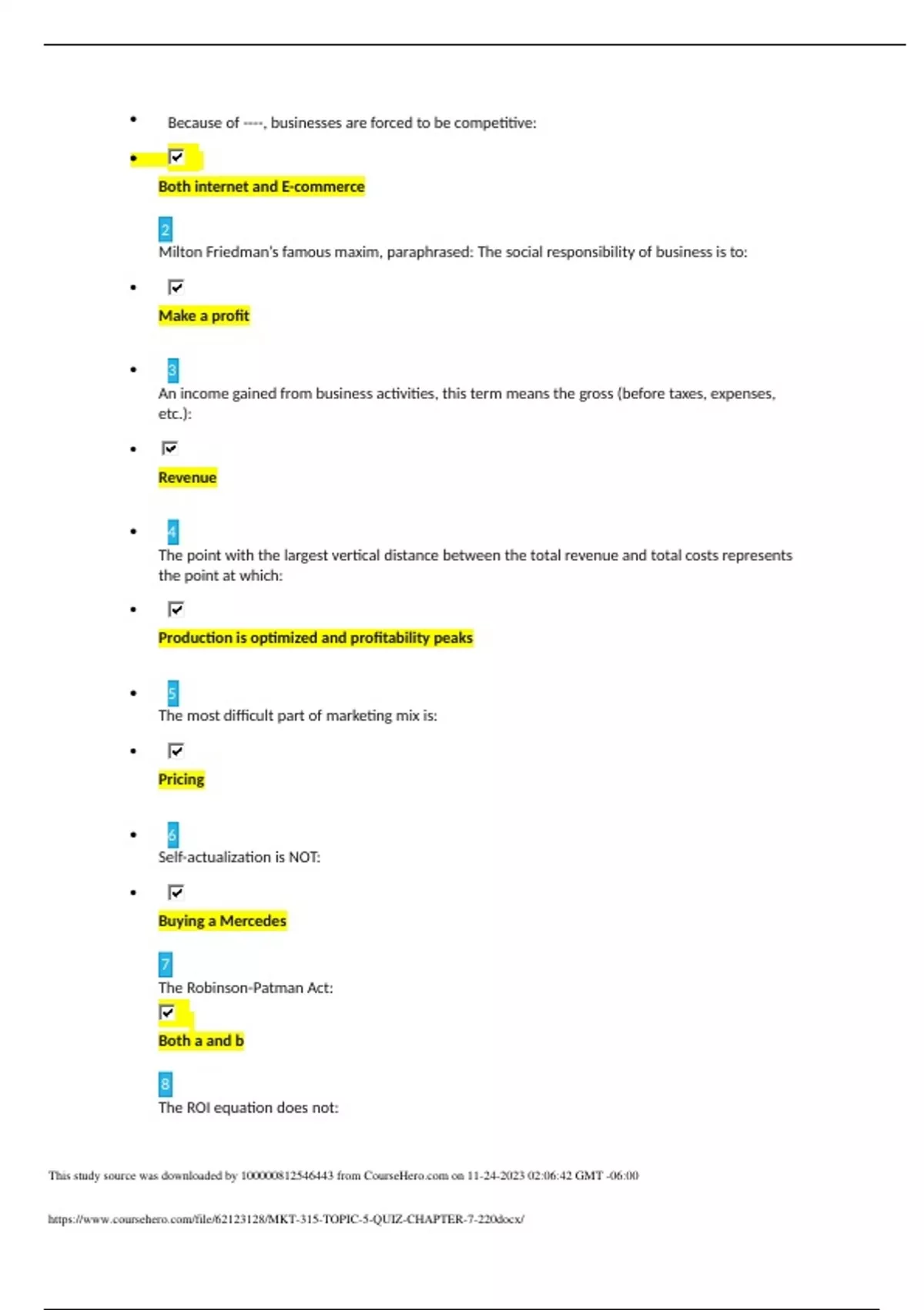 MKT 315 TOPIC 5 QUIZ CHAPTER 7 2.20 question and answers