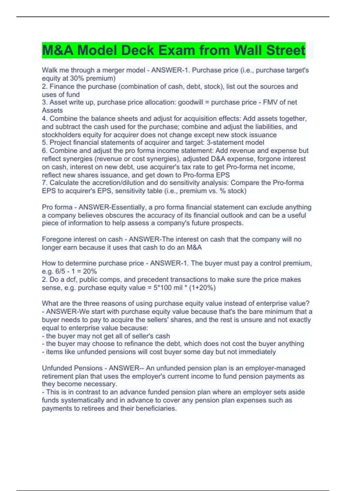 M&A Model Deck Exam from Wall Street