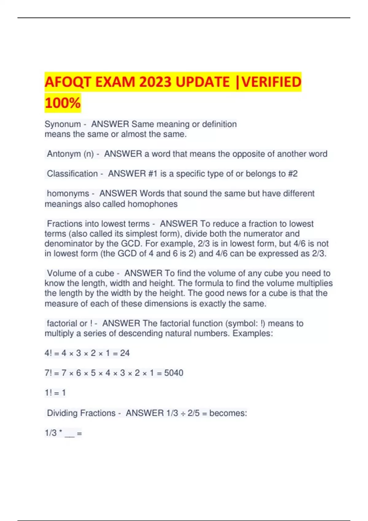 AFOQT EXAM 2023 UPDATE |VERIFIED 100% Synonum - ANSWER Same meaning or definition means the same or almost the same. Antonym (n) - ANSWER a word that means the opposite of another word Classification - ANSWER #1 is a specific type of or belongs to #2 homonyms - ANSWER Words that sound the same but have different meanings also called homophones Fractions into lowest terms - ANSWER To reduce a fraction to lowest terms (also called its simplest form), divide both the numerator and denominator by the GCD. For example, 2/3 is in lowest form, but 4/6 is not in lowest form (the GCD of 4 and 6 is 2) and 4/6 can be expressed as 2/3. Volume of a cube - ANSWER To find the volume of any cube you need to know the length, width and height. The formula to find the volume multiplies the length by the width by the height. The good news for a cube is that the measure of each of these dimensions is exactly the same. factorial or ! - ANSWER The factorial function (symbol: !) means to multiply a series of descending natural numbers. Examples: 4! = 4 × 3 × 2 × 1 = 24 7! = 7 × 6 × 5 × 4 × 3 × 2 × 1 = 5040 1! = 1 Dividing Fractions - ANSWER 1/3 ÷ 2/5 = becomes: 1/3 * __ = Now we flip the second fraction (2/5) over to find its reciprocal, 5/2: 1/3 * 5/2 = Now multiply the numerators (top numbers) of the two fractions, 1*5 = 5. 1/3 * 5/2 = 5/ Now multiply the denominators (bottom numbers) of the two fractions, 3*2 = 6. We now have: 1/3 * 5/2 = 5/6 This particular fraction cannot be simplified further, so we have our answer. Types of analogies - ANSWER synonym, antonym, action, function, size, degree, amount, part to whole, member to group, units of measurement, mathematical Types of numbers - ANSWER natural: greater than 0 and has no decimal or fraction Whole: natural numbers and 0 Integer: positive/negative numbers and 0 Rational: can be represented as fraction or decimal , must terminate or resolve into repeating pattern Irrational: cannot be represented as a fraction, decimal never ends or resolves into pattern (ex. pi) Real: number that can be represented by a point on a number line. Includes all rational/irrational Imaginary: includes the imaginary unit i = square root of -1. complex: in the form of a + bi where a and b are real numbers Closed number system - ANSWER a system is closed under an operation if performing that operation on two elements of the system results in another element of that system Properties of number systems - ANSWER adding, subtracting, and multiplying are closed. dividing is not. rational numbers are closed under all operations except division real numbers are closed under all operations complex numbers are closed under all four operations irrational numbers are not closed under any of the operations Commutative property - ANSWER holds for a operation if the order doesnt matter Associative property - ANSWER the elements of an operation can be regrouped without changing the result Distributive property - ANSWER multiplication over addition allows a product of sums to be written as a sum of products: a(b+c)= ab + ac Identity element - ANSWER operation performed with an element and the identity element the result is the element (a x 1 = a) Inverse element - ANSWER operation performed with the inverse element results in the identity element a + (-a) = 0 American units - ANSWER length: inch/foot/yard/mile mass: ounce/pound/ton volume: cup/pint/quart/gallon force: pound-force pressure: pound-force per square inch work and energy: cal/british thermal unit temperature: fahrenheit charge: faraday SI units - ANSWER length: meter mass: gram volume: liter force: newton pressure: pascal work and energy: joule temperature: kelvin charge: coulomb metric prefixes - ANSWER tera: 10^12 T giga: 10^9 G mega: 10^6 M kilo: 10^3 k hecto: 10^2 h deca: 10^1 d