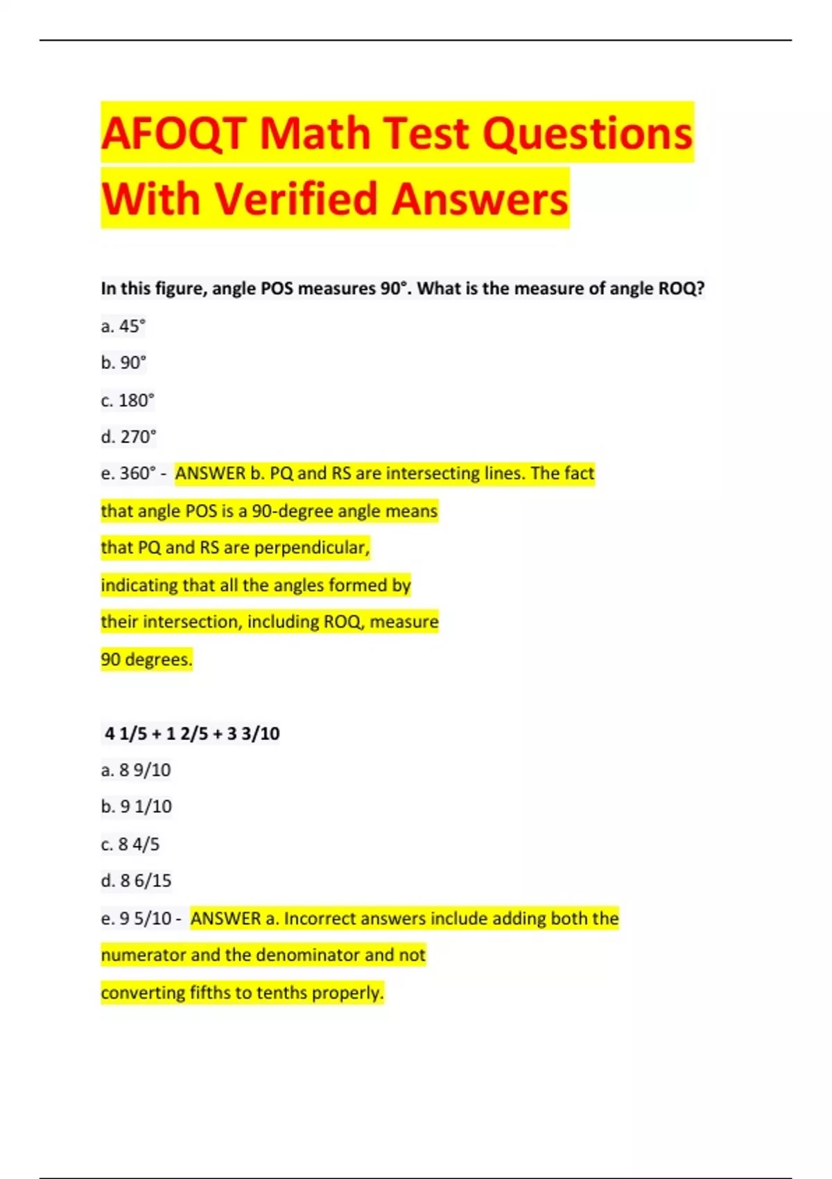 AFOQT Math Test Questions With Verified Answers In this figure, angle POS measures 90°. What is the measure of angle ROQ? a. 45° b. 90° c. 180° d. 270° e. 360° - ANSWER b. PQ and RS are intersecting lines. The fact that angle POS is a 90-degree angle means that PQ and RS are perpendicular, indicating that all the angles formed by their intersection, including ROQ, measure 90 degrees. 4 1/5 + 1 2/5 + 3 3/10 a. 8 9/10 b. 9 1/10 c. 8 4/5 d. 8 6/15 e. 9 5/10 - ANSWER a. Incorrect answers include adding both the numerator and the denominator and not converting fifths to tenths properly. 3/4 is equal to a. 0.25 b. 0.30 c. 0.34 d. 0.50 e. 0.75 - ANSWER e. To convert a fraction to a decimal, divide the numerator, 3, by the denominator, 4. 3 ÷ 4 = 0.75. 76 1/2 + 11 5/6 = a. 87 1/2 b. 88 1/3 c. 88 2/3 d. 88 5/6 e. 89 - ANSWER b. The correct answer is 88 1/3. What is the decimal equivalent of 1/6 rounded to the nearest thousandth? a. 0.165 b. 0.666 c. 0.123 d. 0.167 e. 0.176 - ANSWER d. Divide the numerator by the denominator: 1 ÷ 6 = 0.166667. Round the answer to the thousandths place (three decimal places) to get the answer 0.167. 1/6 + 7/12 + 2/3 = a. 10/24 b. 2 1/6 c. 1 5/6 d. 1 5/12 e. 2 5/6 - ANSWER d. You have to convert all three fractions to twelfths before adding them. Which of the following is equivalent to 202,436? a. 20,000 + 2,000 + 400 + 30 +
