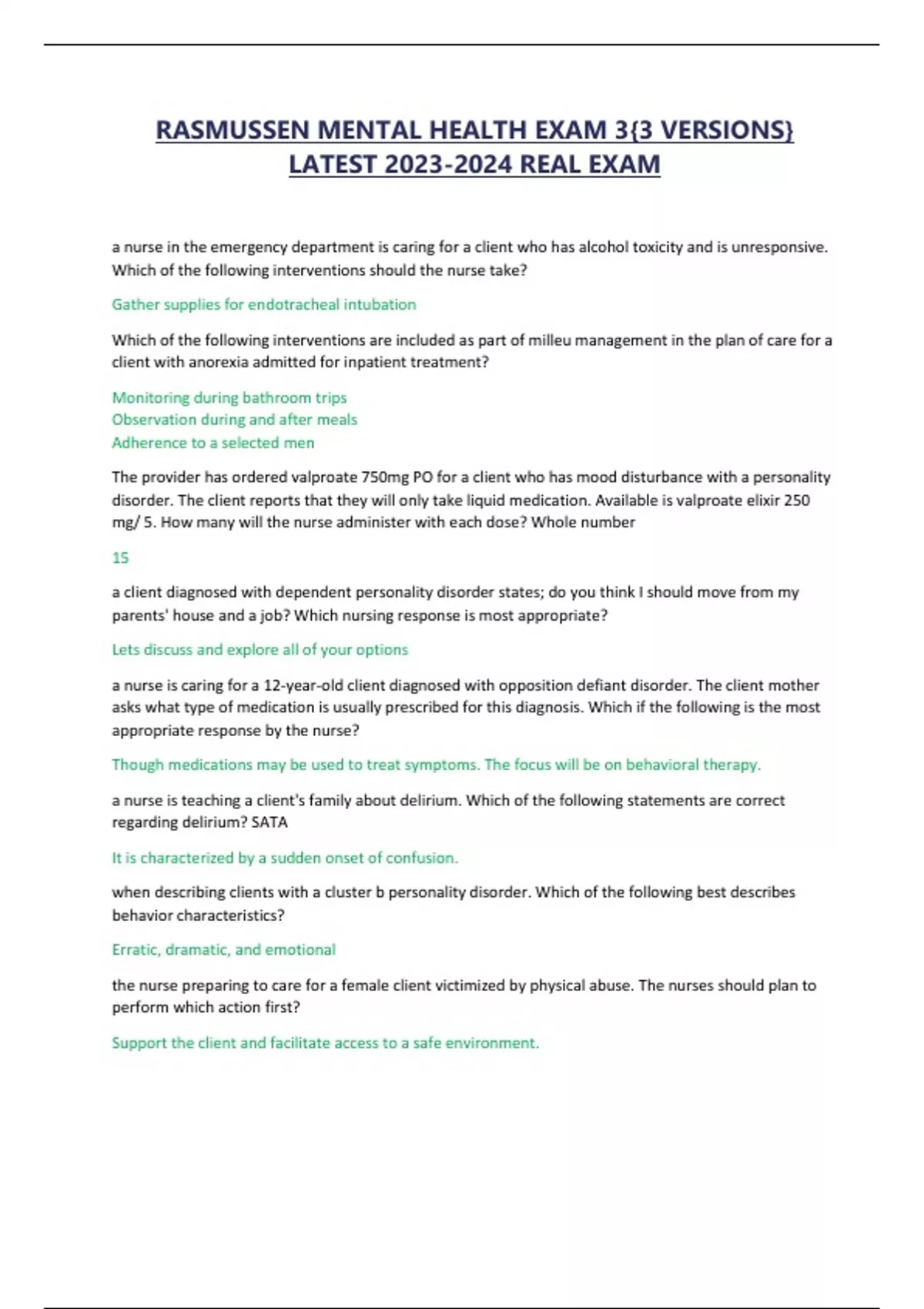 RASMUSSEN MENTAL HEALTH EXAM 3{3 VERSIONS} LATEST REAL EXAM GRADED A!!
