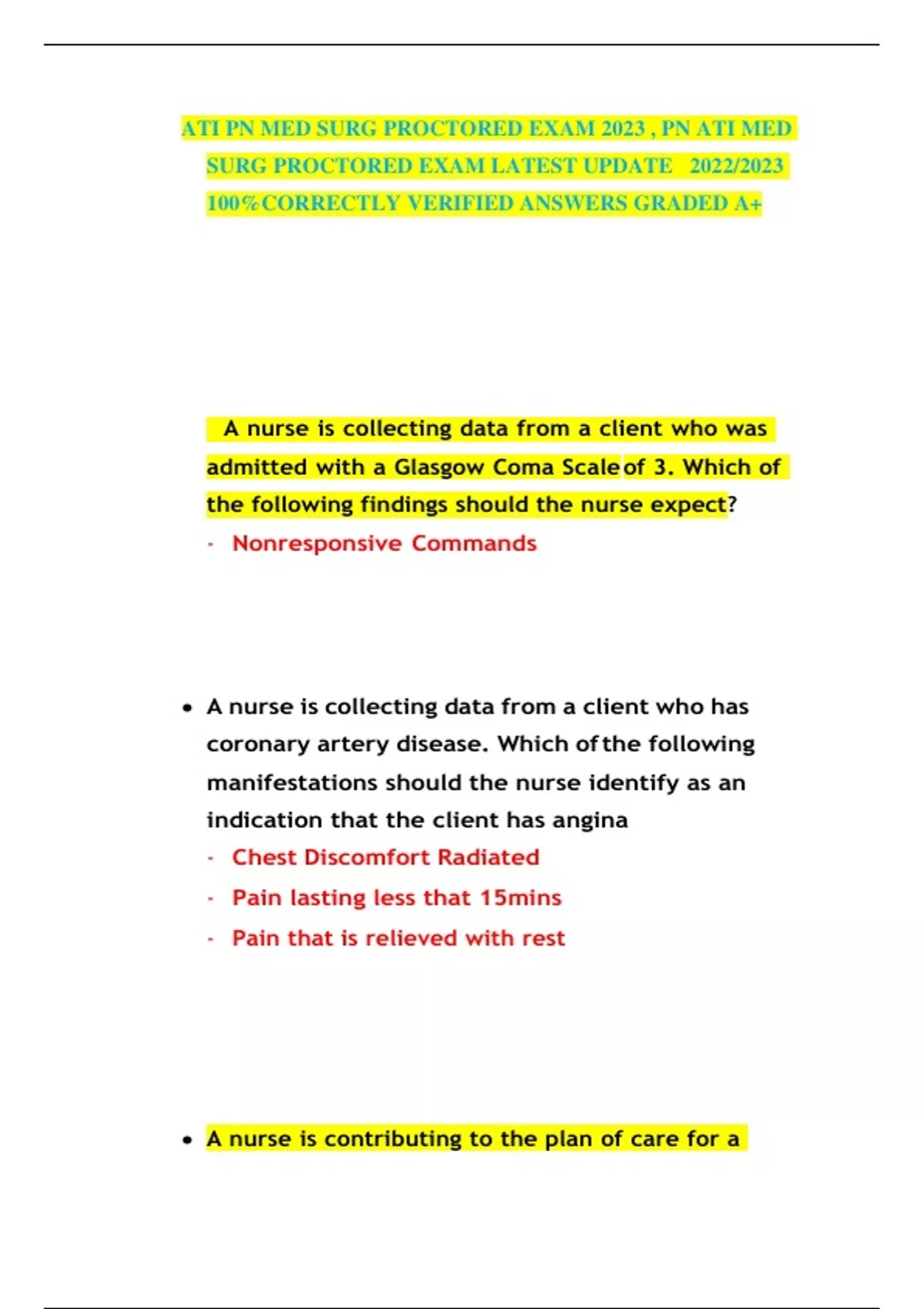 A nurse is collecting data from a client who was admitted with a Glasgow Coma Scaleof 3. Which of the following findings should the nurse expect? - Nonresponsive Commands • A nurse is collecting data from a client who has coronary artery disease. Which ofthe following manifestations should the nurse identify as an indication that the client has angina - Chest Discomfort Radiated - Pain lasting less that 15mins - Pain that is relieved with rest • A nurse is contributing to the plan of care for a client who has a neurogenic bladder following a spinal cord injury. Which of the following interventions shouldthe nurse include in the plan to develop bladder control - Stroke the inner thigh • A nurse is reviewing the medical record of a client who has systemic lupus erythematosus. Which of the following findings should the nurse expect - Joint pain • A nurse is reinforcing dietary teaching with a client who has a new diagnosis ofGERD about foods to avoid because they worsen the manifestations of GERD. Which of the following foods should the nurse instruct the clients to avoid - Peppermint • A nurse is planning care for a client who is receiving bolus enteral feedings and isprescribed digoxin and furosemide. Which of the following actions should the nurse take - Flush the tube with water before and after each medication • A nurse is reinforcing teaching about the use of an Oxygen concentrator in the home for a client who has end stage emphysema. Which of the following instructions should the nurse include to promote client safety - Maintain an electrical back up system • A nurse is caring for a client who has type 1 diabetes mellitus and reports hunger and weakness. The clients blood glucose is 50gm/dL. Which of the following actions should the nurse take -Have the client drink a glass of milk • A nurse is assisting a client who has hypertension in making healthy dietary selections regarding sodium intake. Which of the following foods should the nurse instruct the client to avoid? - Pretzels • A nurse is collecting data from a client who has a new diagnosis of pheochromocytoma. Which of the following findings should the nurse expect - Hypertension • A nurse is reinforcing teaching with a client who has gastric bleeding and is to havea gastric lavage by closed system irrigation. Which of the following statements should the nurse include? - You should expect to be positioned in a semiupright position • A nurse is collecting data from a client who has right-sided heart failure. Which ofthe following findings should the nurse expect - Peripheral Edema - Hepatomegaly - Abdominal Distension • A nurse is reinforcing teaching with a client who is experiencing neutropeniaas a result of chemotherapy. Which of the following information should thenurse include - Bathe with antimicrobial soap daily - Take temperature daily - Avoid gardening • A nurse is reinforcing teaching about home care with the caregiver of a client whois in the early stages of Alzheimer’s disease. Which of the following information should the nurse include - Put labels on the kitchen cabinets and drawers • A nurse is collecting data from a nurse who has sodium level of 128mEq/L. Which ofthe following findings should the nurse expect - Mental Confusion • A nurse is reinforcing teaching with a client who has prescription for clopidogrelfollowing a thrombotic stroke. Which of the following information should the nurse include in the teaching - The medication prevents Clot formation • A nurse is reinforcing teaching with a client who is recovering from severe diarrhea and