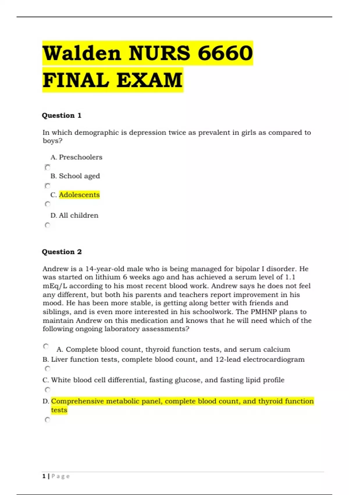 Walden NURS 6660 FINAL EXAMQuestion 1 In which demographic is depression twice as prevalent in girls as compared to boys? A. Preschoolers B. School aged C. Adolescents D. All children Question 2 Andrew is a 14-year-old male who is being managed for bipolar I disorder. He was started on lithium 6 weeks ago and has achieved a serum level of 1.1 mEq/L according to his most recent blood work. Andrew says he does not feel any different, but both his parents and teachers report improvement in his mood. He has been more stable, is getting along better with friends and siblings, and is even more interested in his schoolwork. The PMHNP plans to maintain Andrew on this medication and knows that he will need which of the following ongoing laboratory assessments? A. Complete blood count, thyroid function tests, and serum calcium B. Liver function tests, complete blood count, and 12-lead electrocardiogram C. White blood cell differential, fasting glucose, and fasting lipid profile D. Comprehensive metabolic panel, complete blood count, and thyroid function tests 1 | P a g eQuestion 3 Confidentiality is a complex topic in the world of child and adolescent psychiatry. The last 40 to 50 years have been characterized by increased attention to this issue and the publication of various ethical codes and practice position statements by professional organizations. Which of the following is not a true statement with respect to confidentiality of the child or adolescent client? A. The PMHNP should not be concerned with consent for disclosure when child abuse or maltreatment has occurred. WALDEN UNIVERSITY NURS 6660 FINAL EXAM B. In 1979, the American Psychiatric Association (APA) stated that children 12 years of age or older can give consent for disclosure. C. The American Academy of Child and Adolescent Psychiatry (AACAP) Code of Ethics states that consent is not required for disclosure. D. Regardless of code or position statement by any organization, the best approach is when the child and PMHNP agree on disclosure. Question 4 Debi is a 15-year-old girl who is currently being treated for depression. Her parents have been very proactive and involved in her care, and Debi has achieved remission 2 months after beginning treatment with a combination of pharmacotherapy and cognitive behavioral therapy. While counseling Debi’s parents about important issues in management, the PMHNP advises that: A. There is a 50% likelihood that Debi’s younger sibling will develop depressive symptoms B. The mean length of major depressive episode in adolescents is 4 monthsC. 20 to 40% of adolescents who have major depressive disorder will develop bipolar I within 5 years D. Adolescent-onset depression typically needs long-term pharmacologic management to prevent relapse Question 5 The therapeutic outcomes for children with disorders of written expression are most favorable when they are characterized by: Concomitant pharmacotherapy with a psychostimulant to promote attention and focus Multimodal therapy to include group interaction with peer-to-peer feedback on writing samples A variety of tutors who will offer a variety of writing techniques, composition strategies, and critiques Intensive, continuous administration of individually tailored, one-on-one expressive and creative writing therapy Question 6 When considering a diagnosis of developmental coordination disorder, the PMHNP knows that the diagnosis may be associated with: A. Above-average scores on performance subtests of standardized intelligence testing B. Below-average scores on verbal subtests of standardized intelligence testing C. Soft neurologic signs on physical examination such as slight reflex abnormalities D. Physical findings consistent with neuromuscular disease such as muscular dystrophy 3 | P a g eQuestion 7 Caylee is a 5-year-old girl who is referred for evaluation by child protective services. She was recently removed from her biological family and placed in foster care, as her home environment was reportedly unsafe due to conditions of extreme neglect. Her foster mother reports that Caylee is very quiet and withdrawn and always appears sad and disinterested in her surroundings; however, she becomes very irritable when anything unexpected or unplanned occurs. The foster mother became very concerned when it appeared that Caylee was hallucinating. The PMHNP considers that: B. A. Caylee is at high risk for suicide and precautions should be taken The hallucinations are consistent with brief psychotic disorder or schizophrenia C. The history and reported symptoms are typical of depressive disorder in young children D. This is a common situation when prepubertal children are removed from the biological parents regardless of how dysfunctional they are Question 8 Children with gender dysphoria typically have higher rates of all the following except: A. Depression B. Impulse control disorders C. Anxiety disorders D. Eating disorderQuestion 9 Eileen is a 23-month-old girl who is being evaluated for autism spectrum disorder because her pediatrician is concerned about the presence of developmental red flags. She has just a few words of speech and has not put together any meaningful two-word phrases. While taking a history from Eileen’s mother the PMHNP learns that for approximately the last 2 months Eileen has been seen eating paint chips that are peeling off the baseboard and window sills in the family home; when she sees one she puts it in her mouth. This is a concern because they live in an old farmhouse and there may be lead- based paint in some of the paint layers. The PMHNP considers that which of the following is not consistent with a diagnosis of pica? A. A diagnosis of autism spectrum disorder B. Symptoms 6 months duration C. The pattern of eating D. Lack of potential consequences Question 10 The current scholarly consensus is that the etiology of bulimia nervosa is multifactorial to include biological, sociocultural, family, cognitive-behavioral, and ps