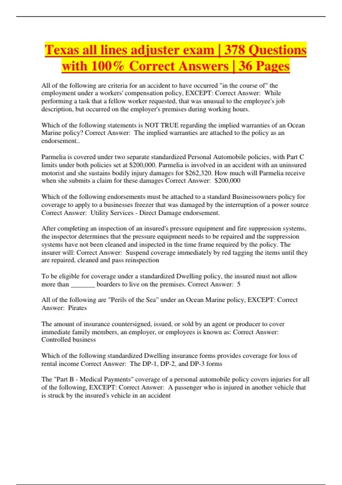 Texas all lines adjuster exam | 378 Questions with 100% Correct Answers | 36 Pages. GRADED A!!