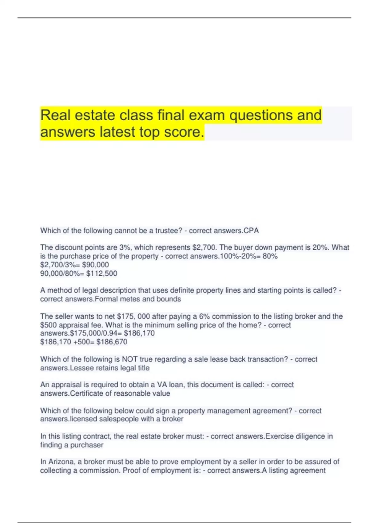 Real estate class final exam questions and answers latest top score. Which of the following cannot be a trustee? - correct answers.CPA The discount points are 3%, which represents $2,700. The buyer down payment is 20%. What is the purchase price of the property - correct answers.100%-20%= 80% $2,700/3%= $90,000 90,000/80%= $112,500 A method of legal description that uses definite property lines and starting points is called? - correct answers.Formal metes and bounds The seller wants to net $175, 000 after paying a 6% commission to the listing broker and the $500 appraisal fee. What is the minimum selling price of the home? - correct answers.$175,000/0.94= $186,170 $186,170 +500= $186,670 Which of the following is NOT true regarding a sale lease back transaction? - correct answers.Lessee retains legal title An appraisal is required to obtain a VA loan, this document is called: - correct answers.Certificate of reasonable value Which of the following below could sign a property management agreement? - correct sed salespeople with a broker In this listing contract, the real estate broker must: - correct answers.Exercise diligence in finding a purchaser In Arizona, a broker must be able to prove employment by a seller in order to be assured of collecting a commission. Proof of employment is: - correct answers.A listing agreement A salesperson works for Broker A and has contracts is escrow. The salesperson decides to leave Broker A and work for Broker B. Which of the following is true regarding the salesperson's commission - correct answers.Broker A would pay the salesperson directly Rank the following liens in the order of their priority from highest to lowest: IRS lien, Property Taxes, Special Assessments - correct answers.Property Taxes, Special Assessments, IRS lien If a property is not bid at a tax lien sale - correct answers.Anyone can later buy the tax lien from the Treasurer How a building is situated on a lot to take advantage of climate and views is - correct answers.Orientation After a mortgage foreclosure any excess monies would go to the: - correct answers.Mortgagor The supply and cost of money can be most effectively controlled by: - correct answers.Federal Reserve System The Consumer Financial Protection Bureau is the governing body for: - correct answers.Savings and loan association At a mortgage foreclosure sale, the buyer gets a deed from: - correct answers.No one Real estate loan usury rates are set by: - correct laws The lender may consider his mortgage or trust deed to be: - correct answers.Personal property A property is in the process of being foreclosed. Who is responsible for the property taxes? - correct answers.Trustor Who gives the right for a party to act in behalf of another in negotiations? - correct answers.Principal What type of loan would change in payment, rate, and amount owed? - correct -end mortgage Which of the following clauses in a conventional mortgage instrument entities the lender to accelerate the loan is assumed? - correct answers.Due on sale Which type of mortgage loan has provisions for periodic changes in the amount of the payment, the interest rate, maturity date,, and the remaining balance owed? - correct answers.Adjustable loan When the rent paid the the lessee, per their lease agreement, is less than the economic rent, this is called: - correct answers.Possessive leasehold In a lease situation, A leases to B and B leases to C. Who is responsible for the rent?A) B to C B) B to A C ) C to A D) A to B - correct answers.b. B to A Which of the items listed below best describes a partition action - correct answers.Divided co-ownership