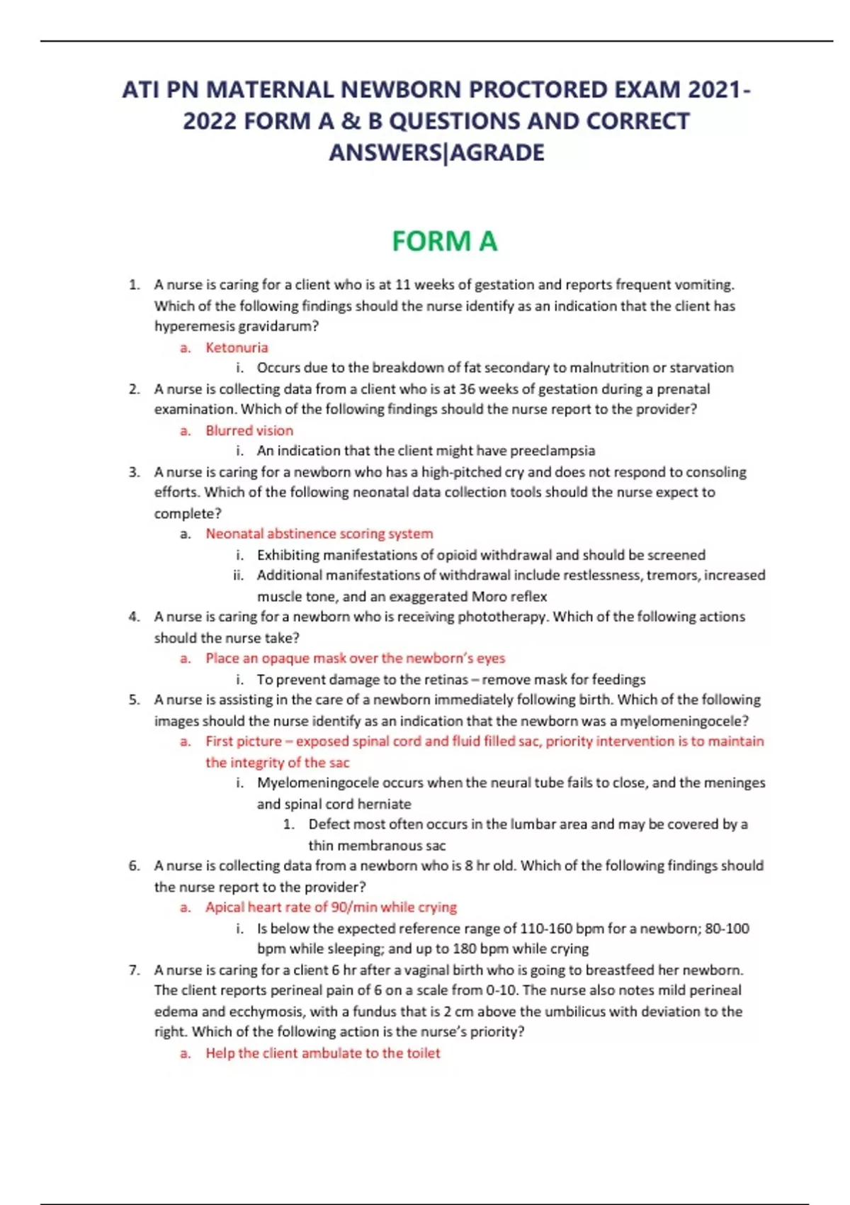 ATI PN MATERNAL NEWBORN PROCTORED EXAM 2023- 2024 FORM A & B QUESTIONS AND CORRECT ANSWERS|AGRADE FORM A 1. A nurse is caring for a client who is at 11 weeks of gestation and reports frequent vomiting. Which of the following findings should the nurse identify as an indication that the client has hyperemesis gravidarum? a. Ketonuria i. Occurs due to the breakdown of fat secondary to malnutrition or starvation 2. A nurse is collecting data from a client who is at 36 weeks of gestation during a prenatal examination. Which of the following findings should the nurse report to the provider? a. Blurred vision i. An indication that the client might have preeclampsia 3. A nurse is caring for a newborn who has a high-pitched cry and does not respond to consoling efforts. Which of the following neonatal data collection tools should the nurse expect to complete? a. Neonatal abstinence scoring system i. Exhibiting manifestations of opioid withdrawal and should be screened ii. Additional manifestations of withdrawal include restlessness, tremors, increased muscle tone, and an exaggerated Moro reflex 4. A nurse is caring for a newborn who is receiving phototherapy. Which of the following actions should the nurse take? a. Place an opaque mask over the newborn’s eyes i. To prevent damage to the retinas – remove mask for feedings 5. A nurse is assisting in the care of a newborn immediately following birth. Which of the following images should the nurse identify as an indication that the newborn was a myelomeningocele? a. First picture – exposed spinal cord and fluid filled sac, priority intervention is to maintain the integrity of the sac i. Myelomeningocele occurs when the neural tube fails to close, and the meninges and spinal cord herniate 1. Defect most often occurs in the lumbar area and may be covered by a thin membranous sac 6. A nurse is collecting data from a newborn who is 8 hr old. Which of the following findings should the nurse report to the provider? a. Apical heart rate of 90/min while crying i. Is below the expected reference range of 110-160 bpm for a newborn; 80-100 bpm while sleeping; and up to 180 bpm while crying 7. A nurse is caring for a client 6 hr after a vaginal birth who is going to breastfeed her newborn. The client reports perineal pain of 6 on a scale from 0-10. The nurse also notes mild perineal edema and ecchymosis, with a fundus that is 2 cm above the umbilicus with deviation to the right. Which of the following action is the nurse’s priority? a. Help the client ambulate to the toilet i. Greatest risk is postpartum hemorrhage from uterine atony; help client to urinate & completely empty the bladder, which will allow the uterus to contract 8. A nurse is reinforcing teaching with a client who is at 20 weeks of gestation and has gestational diabetes mellitus. Which of the following information should the nurse include in the teaching? a. Consume at least 2000 cal/day Is about 35 cal/kg/day – will ensure adequate glucose intake and prevent hypoglycemia 9. A nurse is reinforcing teaching about risk factors for respiratory distress syndrome (RDS) in newborns with a group of clients who are pregnant. Which of the following risk factors should the nurse include? a. Prematurity i. A newborn who is premature has inadequate surfactant production, which can lead to RDS 10. A nurse is caring for a client who is planning to become pregnant. The client asks the nurse why folic acid supplements are necessary. The nurse should inform the client that the purpose of the folic acid supplement is to do which of the following? a. Prevent certain kinds of birth defects i. Help prevent neural tube defects 11. A nurse is reinforcing discharge teaching about methods to prevent engorgement during lactation suppression with a client who is bottle-feeding her newborn. Which of the following statements should the nurse identify as an indication that the client understands the instructions? a. “I will apply cold cabbage leaves to my breasts throughout the day.” i. Frequent application of cold leaves to breasts can prevent engorgement ii. Should also apply ice packs or cold compresses to breasts, take mild analgesics, and wear a well-fitting and supportive bra 12. A nurse is assisting with the care of a client who is at 40 weeks of gestation and is in active labor. Which of the following findings should the nurse report to the charge nurse? a. Prolonged deceleration of FHR i. Can be a manifestation of an emergent condition, such as uterine rupture or umbilical cord prolapse ii. Charge nurse should notify provider about this change 13. A client requests information about the use of a diaphragm for birth control. Which of the following statements should the nurse make? a. “You will need to replace your diaphragm every 2 years.” 14. A nurse is reinforcing teaching with a client who is at 9 weeks of gestation and reports frequent episodes of nausea and vomiting. Which of the following instructions should the nurse include? a. Consume small meals frequently each day i. 5-6 small meals throughout the day – should avoid an empty stomach, as this increases nausea 15. A nurse on a postpartum unit is assisting in the care of a client who is experiencing hypovolemic shock. Which of the following actions should the nurse take? a. Insert an indwelling urinary cat