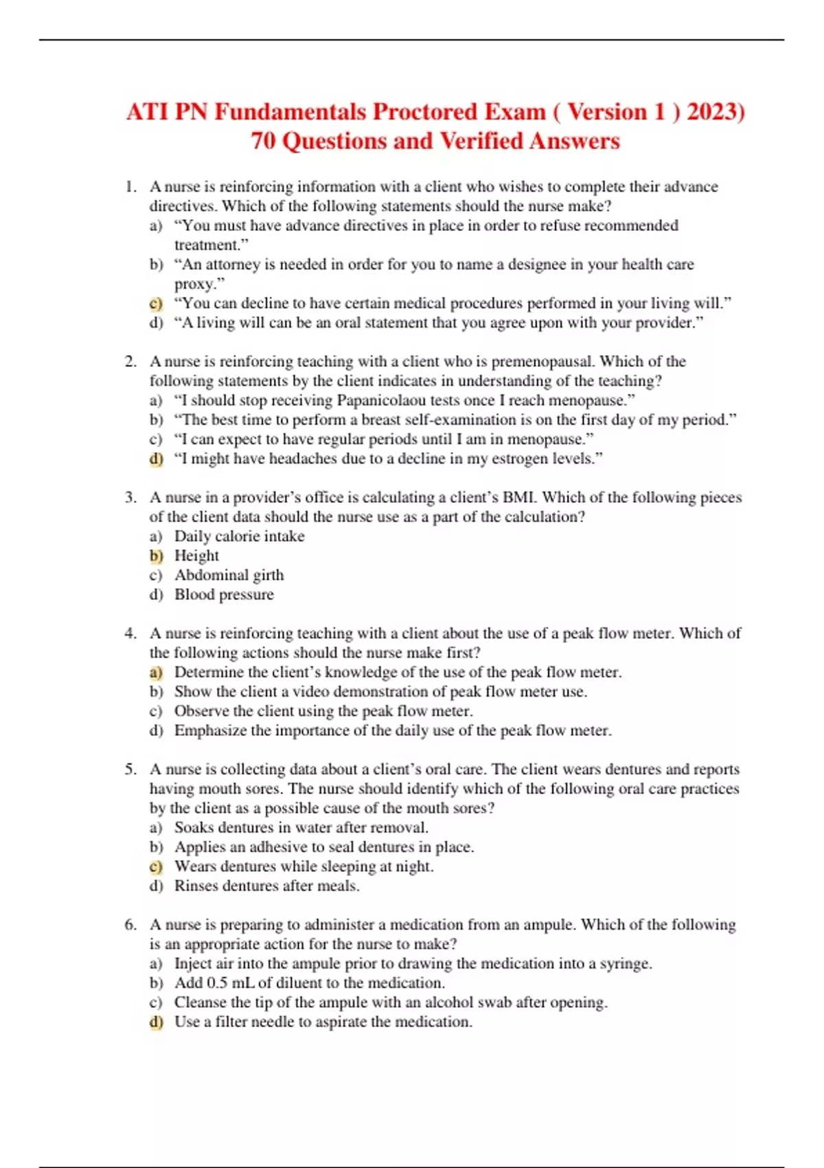 ATI PN Fundamentals Proctored Exam ( Version 1 2023/2024) 70 Questions and Verified Answers A+ GRADE