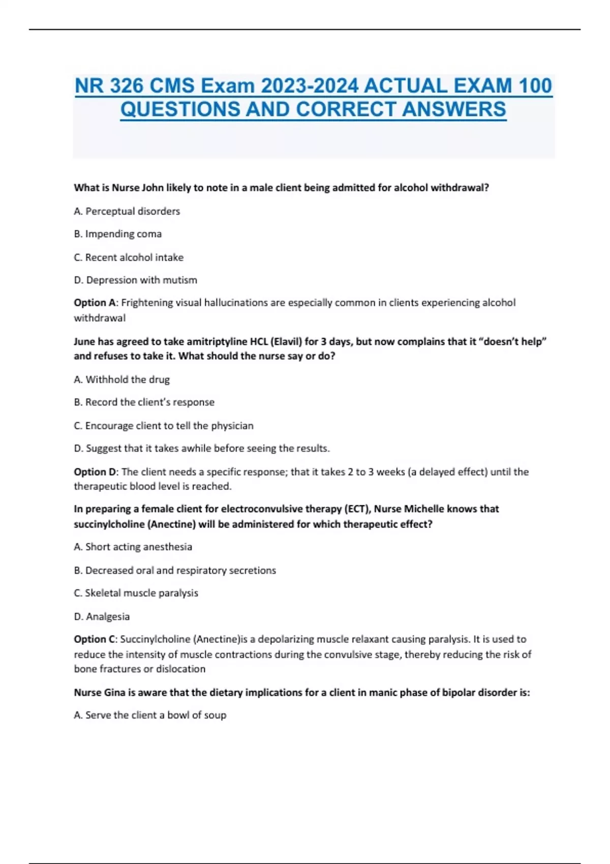 NR 326 CMS Exam ACTUAL FINAL EXAM 100 QUESTIONS AND CORRECT ANSWERS (WITH RATIONALE) . GRADED A+